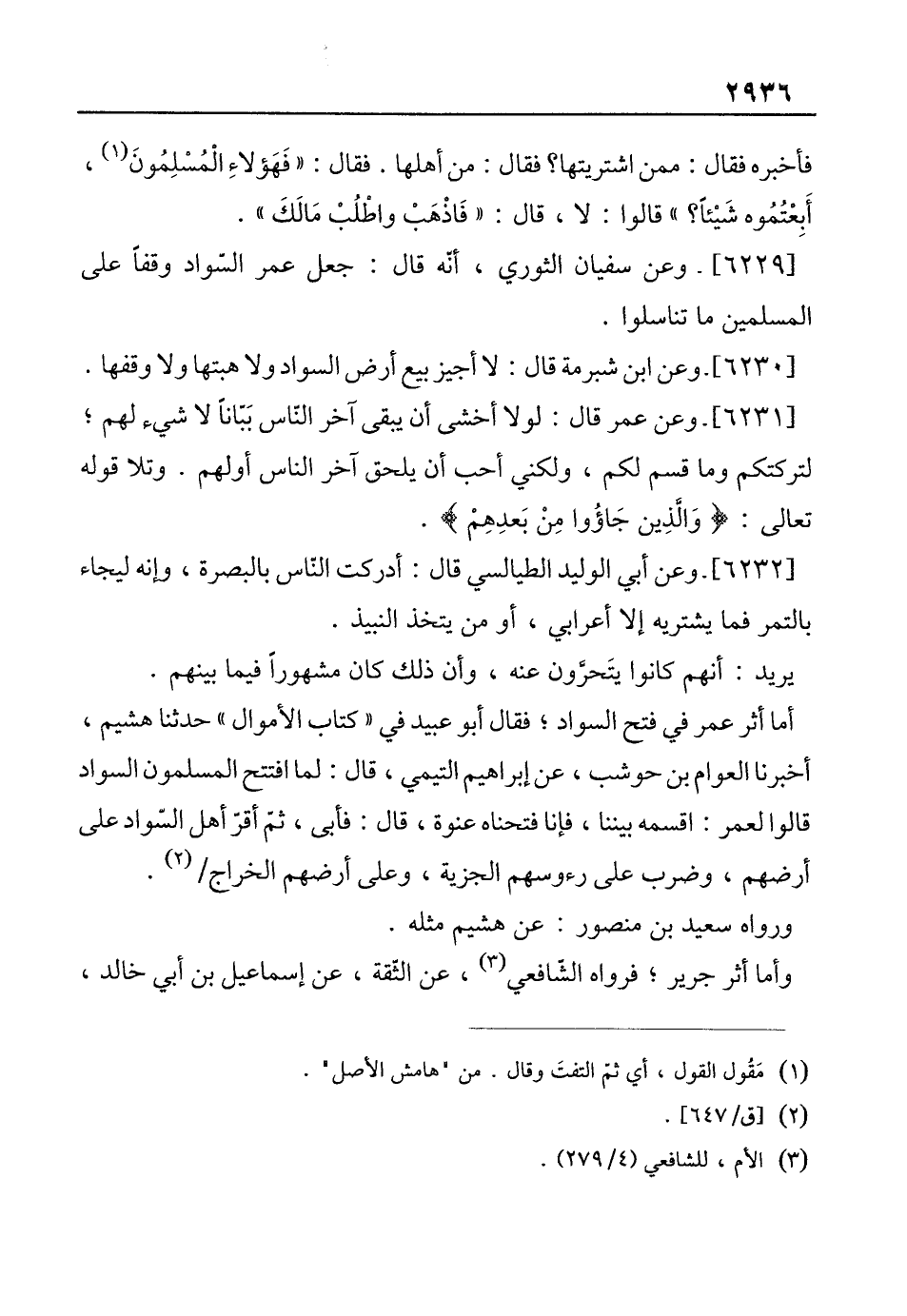أما أثر عمر في فتح السواد؛ فقال أبو عبيد في "كتاب الأموال" حدثنا هشيم، أخبرنا العوام بن حوشب، عن إبراهيم التيمي، قال: لما افتتح المسلمون السواد قالوا لعمر: اقسمه بيننا، فإنا فتحناه عنوة، قال: فأبى، ثمّ أقرّ أهل السّواد على أرضهم، وضرب على رءوسهم الجزية، وعلى أرضهم الخراج (¬2).