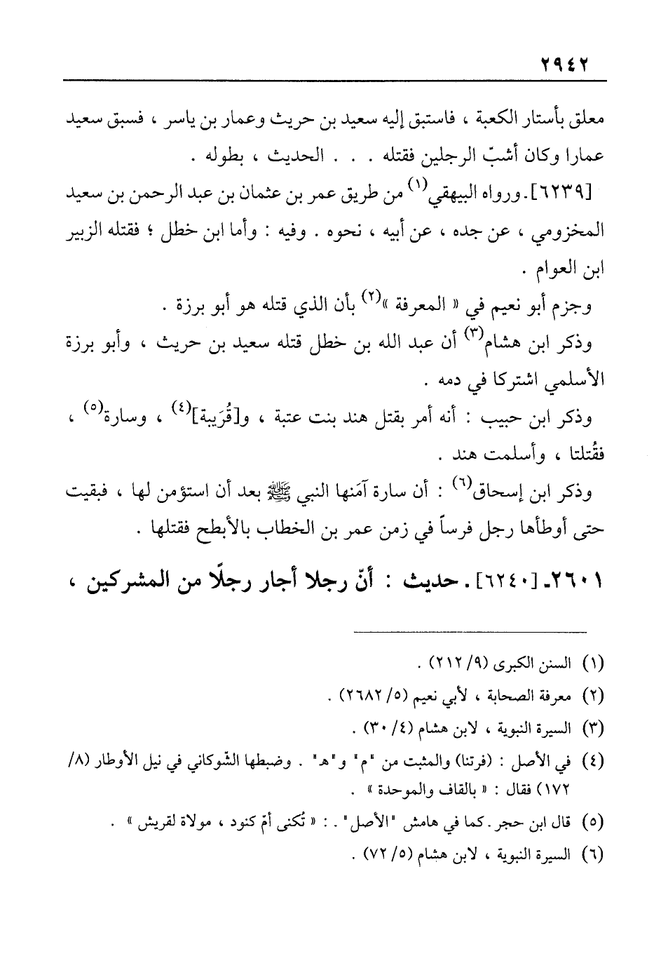 [6239]- ورواه البيهقي (¬1) من طريق عمر بن عثمان بن عبد الرحمن بن سعيد المخزومي، عن جده، عن أبيه، نحوه. وفيه: وأما ابن خطل؛ فقتله الزبير ابن العوام.