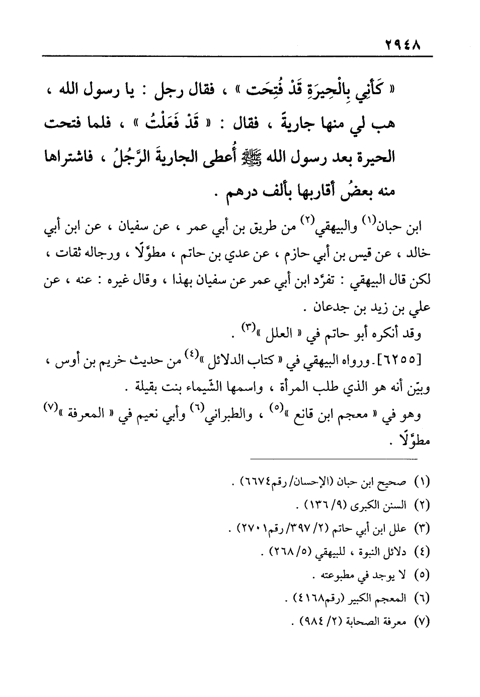 "كَأنِي بِالْحِيرَةِ قَدْ فُتِحَت"، فقال رجل: يا رسول الله، هب لي منها جاريةً، فقال: "قَدْ فَعَلْتُ"، فلما فتحت الحيرة بعد رسول الله - صلى الله عليه وسلم - أُعطى الجاريةَ الرَّجُلُ، فاشتراها منه بعضُ أقاربها بألف درهم.