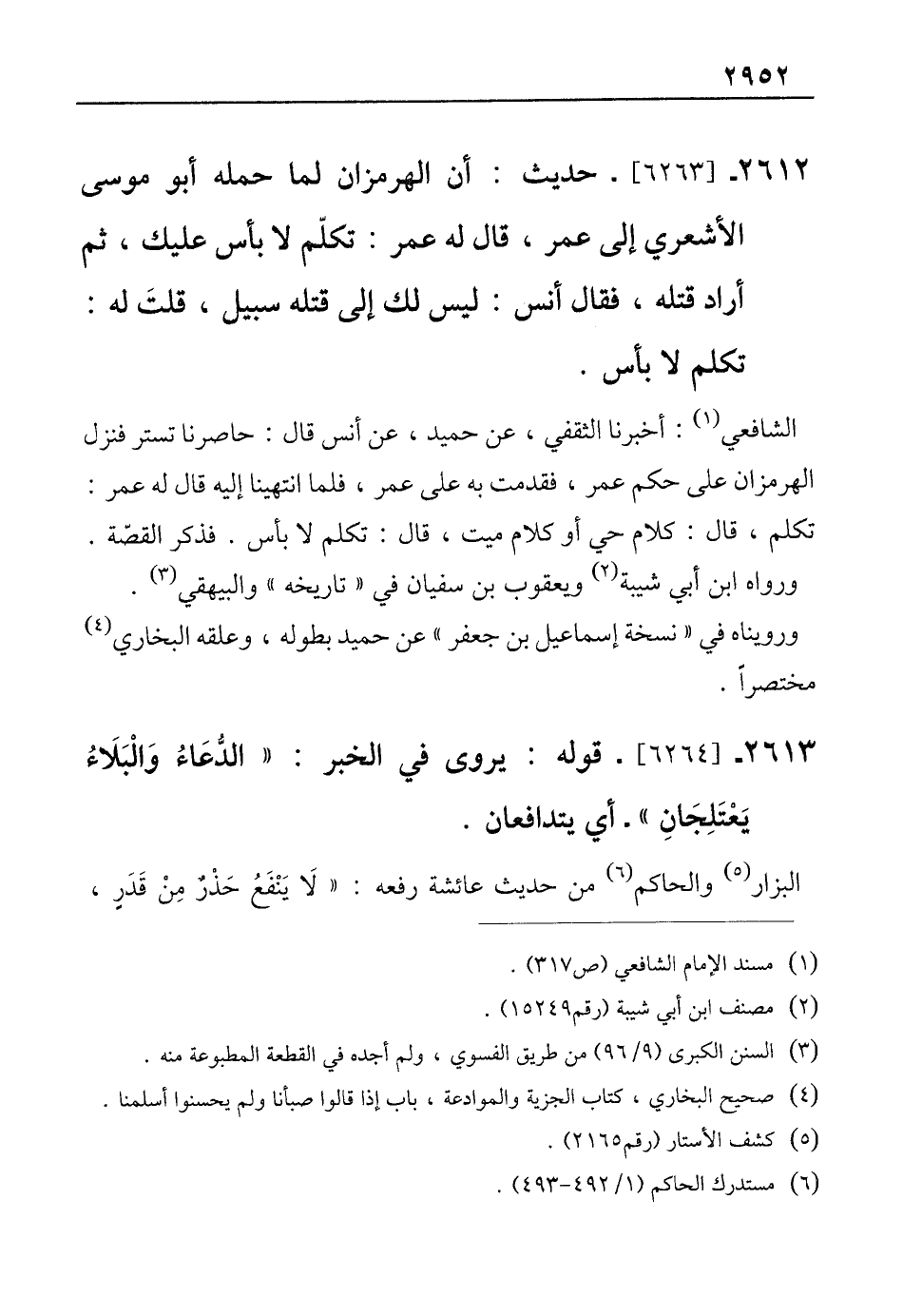 2612 - [6263]- حديث: أن الهرمزان لما حمله أبو موسى الأشعري إلى عمر، قال له عمر: تكلّم لا بأس عليك، ثم أراد قتله، فقال أنس: ليس لك إلى قتله سبيل، قلتَ له: تكلم لا بأس.