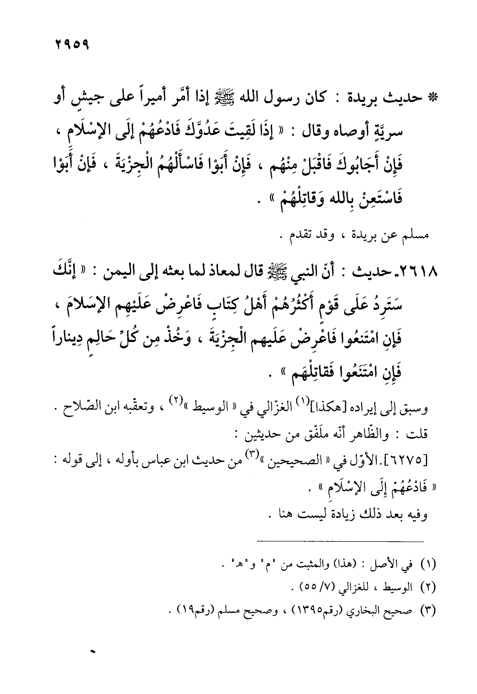 2618 - حديث: أنّ النبي - صلى الله عليه وسلم - قال لمعاذ لما بعثه إلى اليمن: "إنَّكَ سَتَرِدُ عَلَى قَوْمٍ أَكثُرُهُمْ أَهْلُ كِتَابٍ فَاعْرِضْ عَلَيْهِم الإسَلامَ، فَإنِ امْتَنعُوا فَاعْرِضْ عَلَيْهِم الْجِزْيَةَ، وَخُذْ مِن كُلِّ حَالِمٍ دِينارًا فَإِنِ امْتَنَعُوا فَقاتِلْهُم".