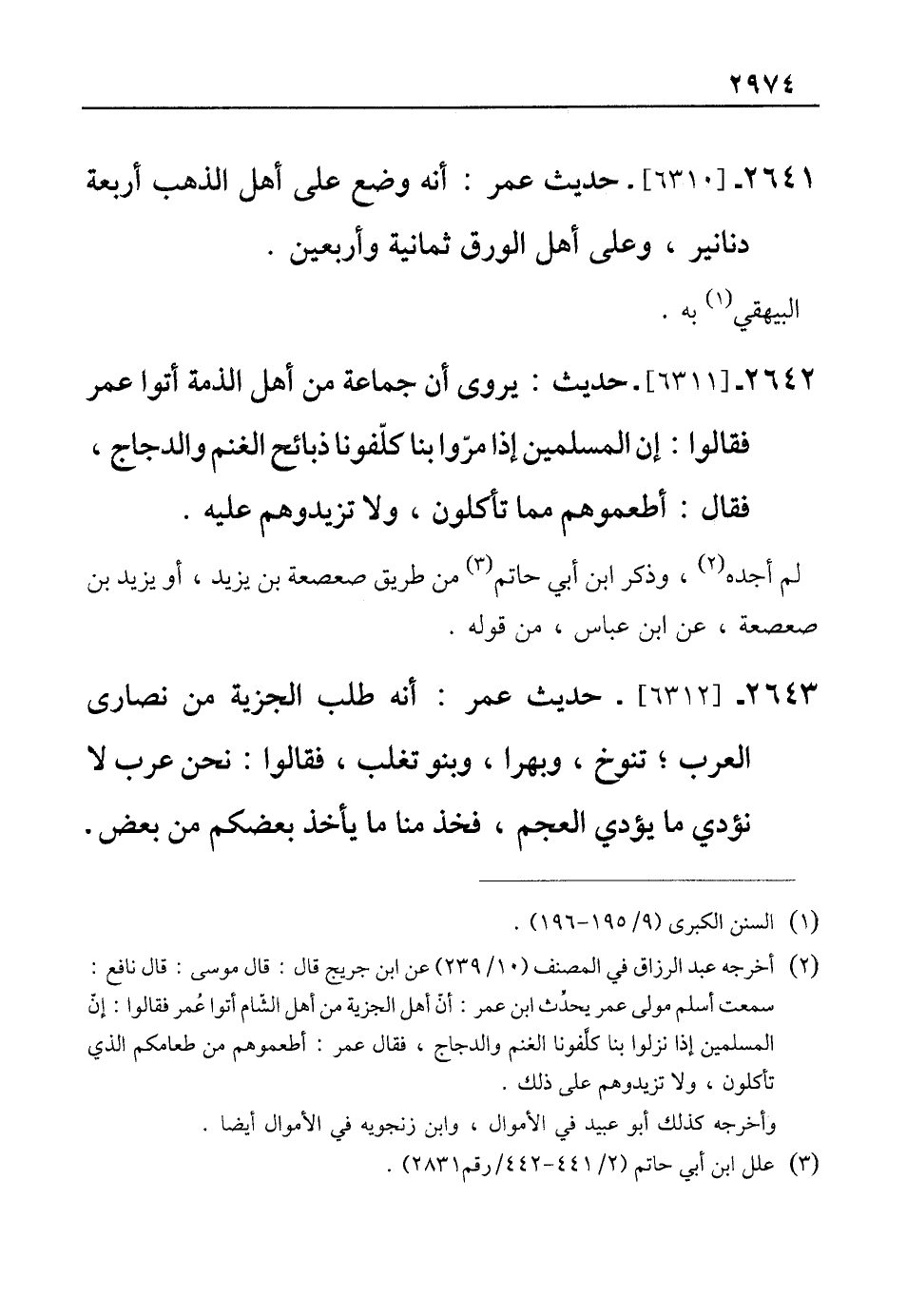 2642 - [6311]- حديث: يروى أن جماعة من أهل الذمة أتوا عمر فقالوا: إن المسلمين إذا مرّوا بنا كلّفونا ذبائح الغنم والدجاج، فقال: أطعموهم مما تأكلون، ولا تزيدوهم عليه.