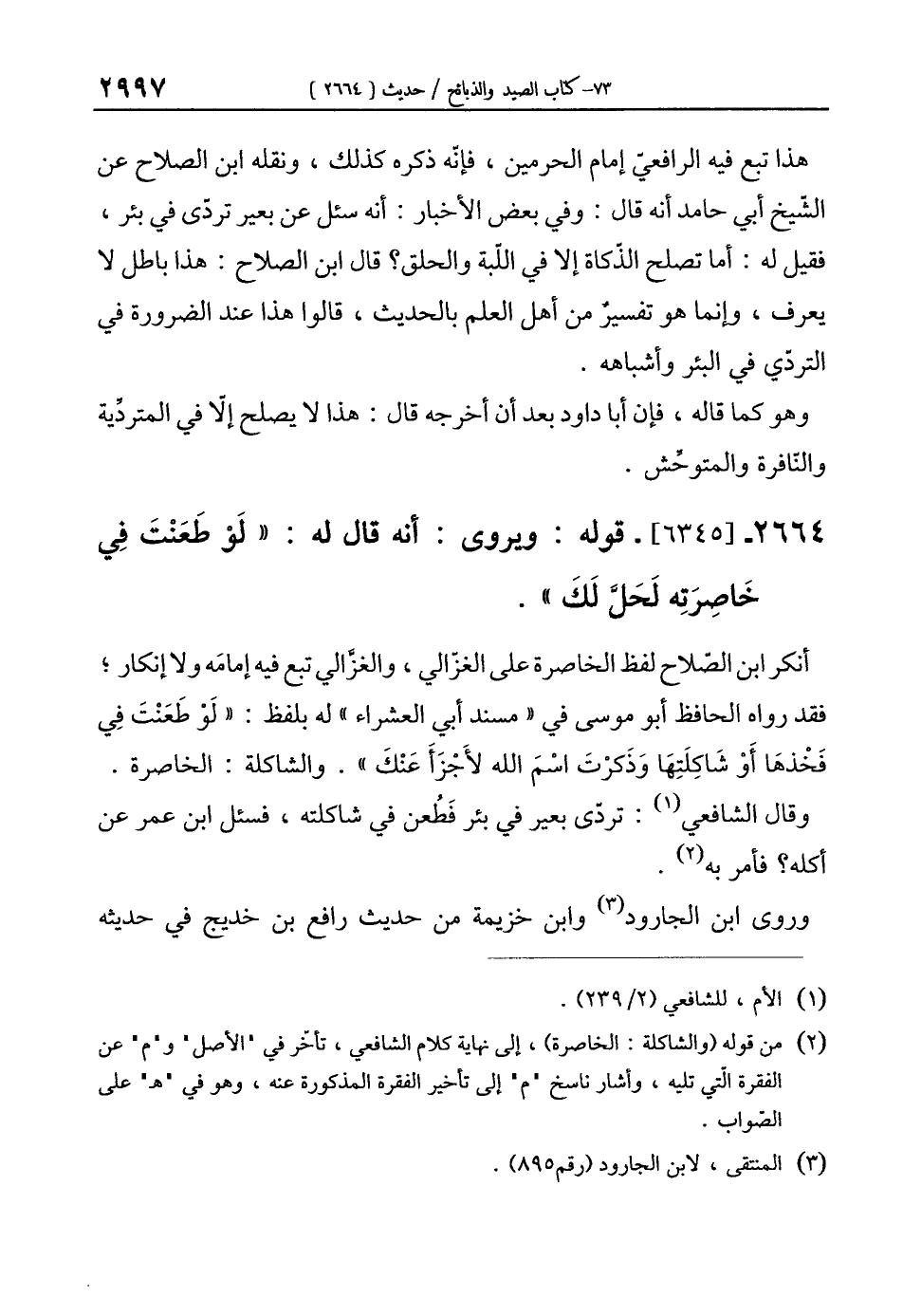 أنكر ابن الصّلاح لفظ الخاصرة على الغزّالي، والغزّالي تبع فيه إمامَه ولا إنكار؛ فقد رواه الحافظ أبو موسى في "مسند أبي العشراء" له بلفظ: "لَوْ طَعَنْتَ في فَخْذهَا أَوْ شَاكِلَتِهَا وَذَكرْتَ اسْمَ الله لأَجْزَأَ عَنْكَ". والشاكلة: الخاصرة.