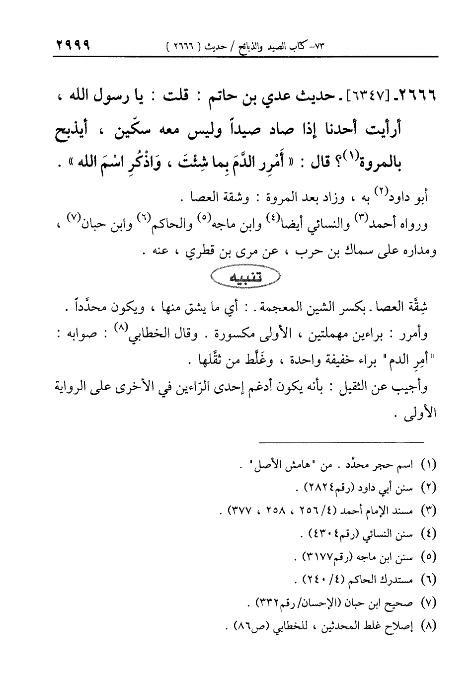 2666 - [6347]- حديث عدي بن حاتم: قلت: يا رسول الله، أرأيت أحدنا إذا صاد صيدًا وليس معه سكّين، أيذبح بالمروة (¬1)؟ قال: "أَمْرِر الدَّمَ بِما شِئْتَ، وَاذْكُرِ اسْمَ الله".