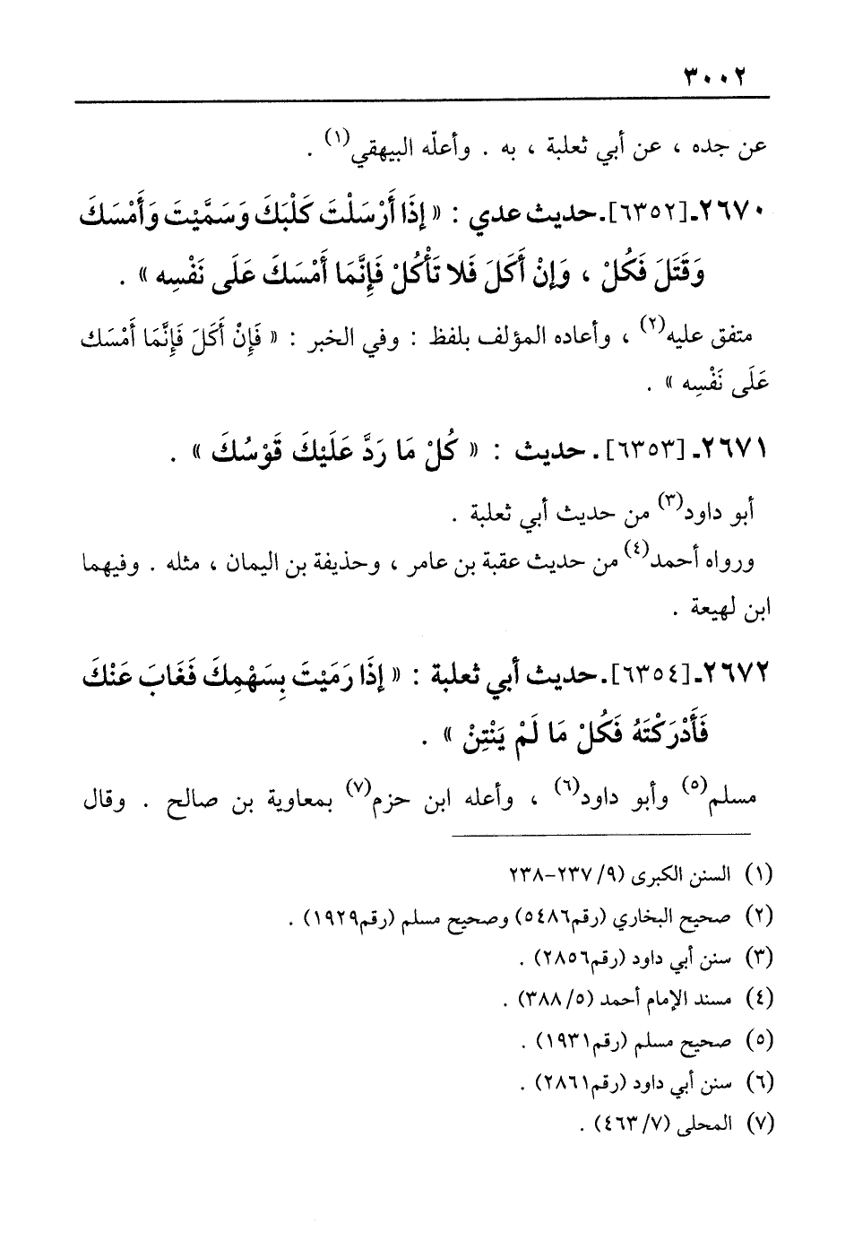 2672 - [6354]- حديث أبي ثعلبة: "إذَا رَمَيتَ بِسَهْمِكَ فَغَابَ عَنْكَ فَأَدْرَكتَهُ فَكُلْ مَا لَمْ يَنْتِنْ".