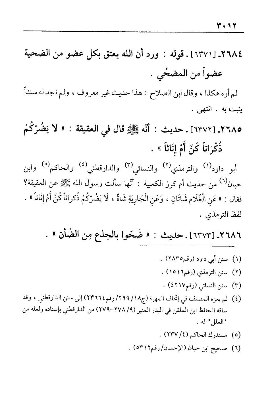 2685 - [6372]- حديث: أنَّه - صلى الله عليه وسلم - قال في العقيقة: لا يَضُرّكمْ ذُكرَانًا كُنَّ أَمْ إِنَاثًا".