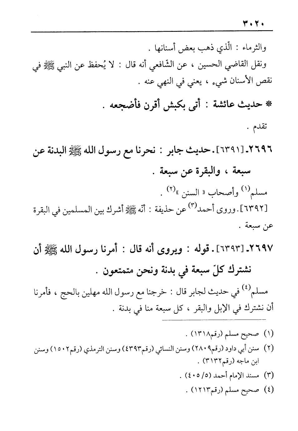 2697 - [6393]- قوله: ويروى أنه قال: أمرنا رسول الله - صلى الله عليه وسلم - أن نشترك كلّ سبعة في بدنة ونحن متمتعون.