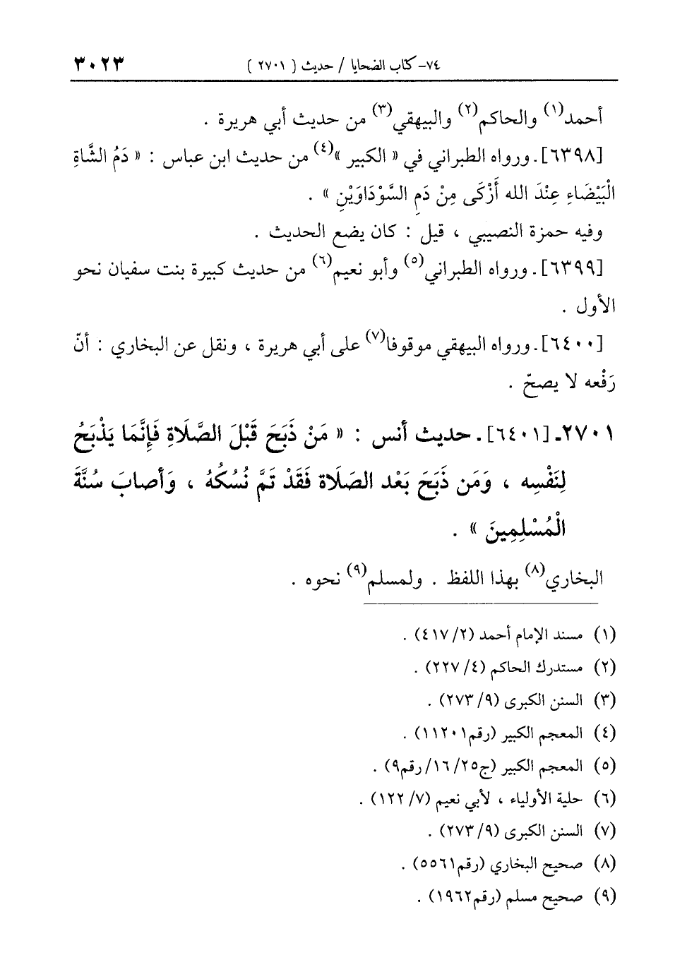2701 - [6401]- حديث أنس. "مَن ذَبَحَ قَبْلَ الصَّلَاةِ فَإِنَّمَا يَذْبَحُ لِنَفْسِه، وَمَن ذَبَحَ بَعْد الصَّلَاة فَقَدْ تَمَّ نُسُكُهُ، وَأصابَ سُنَّةَ الْمُسْلِمِينَ".