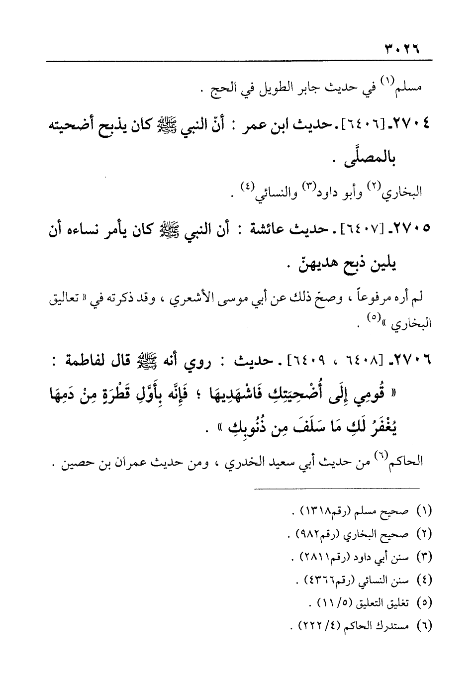 2706 - [6408, 6409] حديث: روى أنه - صلى الله عليه وسلم - قال لفاطمة: "قُومِي إِلَى أُضْحِيَتِكِ فَاشْهَدِيهَا؛ فَإِنَّه بِأَوَّلِ قَطْرَةٍ مِنْ دَمِهَا يُغْفَرُ لَكِ مَا سَلَفَ مِن ذُنُوبِكِ".