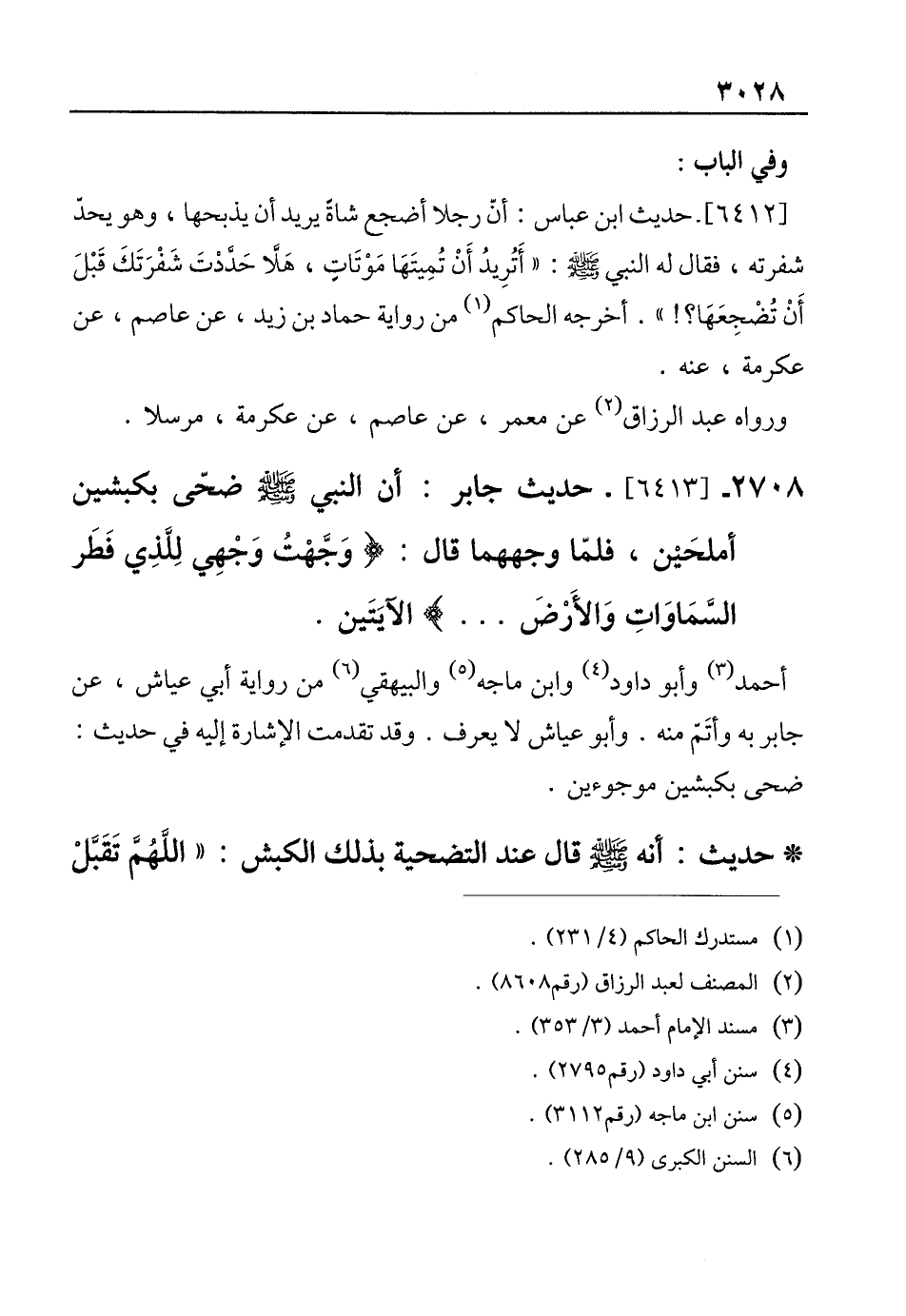 2708 - [6413]- حديث جابر: أنَّ النبي - صلى الله عليه وسلم - ضحّي بكبشين أملحَين، فلمّا وجههما قال: {وَجَّهْتُ وَجْهِيَ لِلَّذِي فَطَرَ السَّمَاوَاتِ وَالْأَرْضَ ...} الآيَتَين.