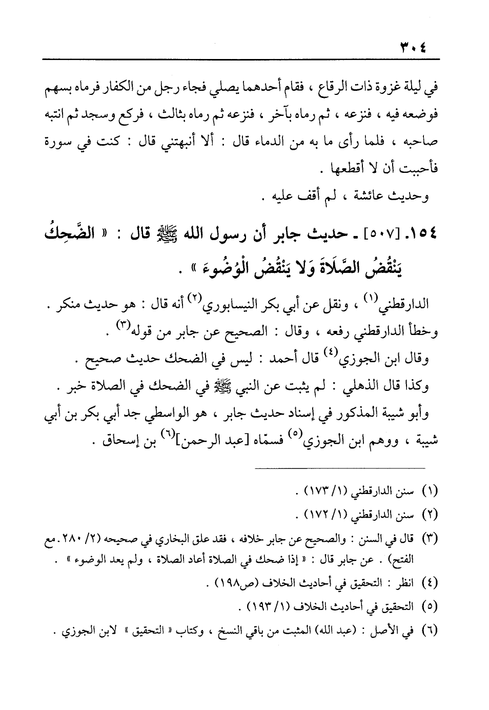 154 - [507]- حديث جابر أن رسول الله - صلى الله عليه وسلم - قال: "الضَّحِكُ يَنْقُضُ الصلاة وَلا يَنْقُضُ الْوُضُوءَ".