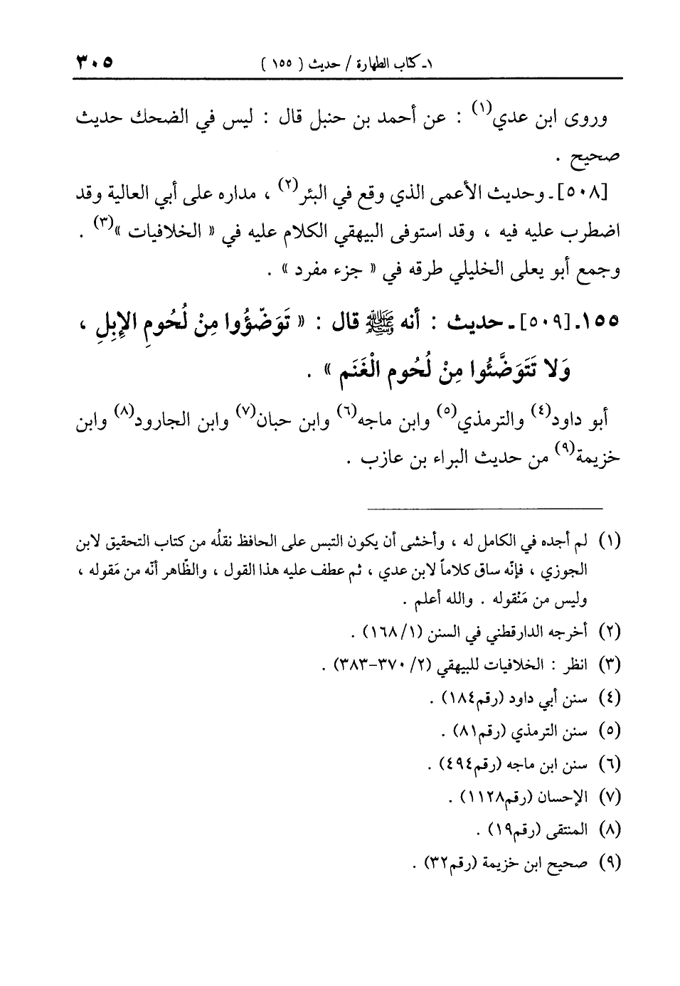 155 - [509]- حديث: أنه - صلى الله عليه وسلم - قال: "تَوَضّؤُوا مِنْ لُحُومِ الإِبِلِ، وَلا تَتَوَضَّئُوا مِنْ لُحُوم الْغَنَم".