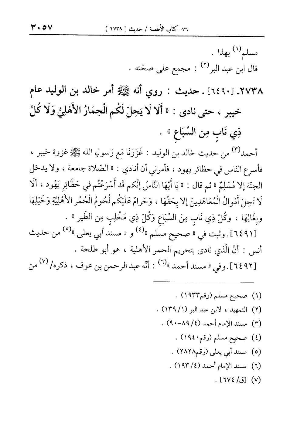 2738 - [6490]- حديث: روي أنَّه - صلى الله عليه وسلم - أمر خالد بن الوليد عام خيبر، حتى نادى: "أَلَا لَا يَحِلّ لَكُم الْحِمَارُ الأَهْليُّ وَلَا كُلُّ ذِي نَابٍ من السِّبَاعِ".