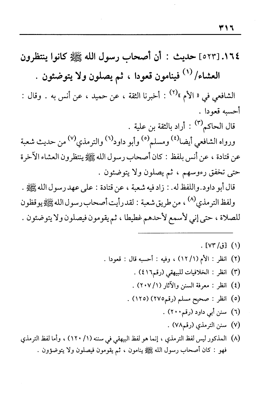 164 - [523] حديث: أن أصحاب رسول الله - صلى الله عليه وسلم - كانوا ينتظرون العشاء/ (¬1) فينامون قعودا، ثم يصلون ولا يتوضئون.