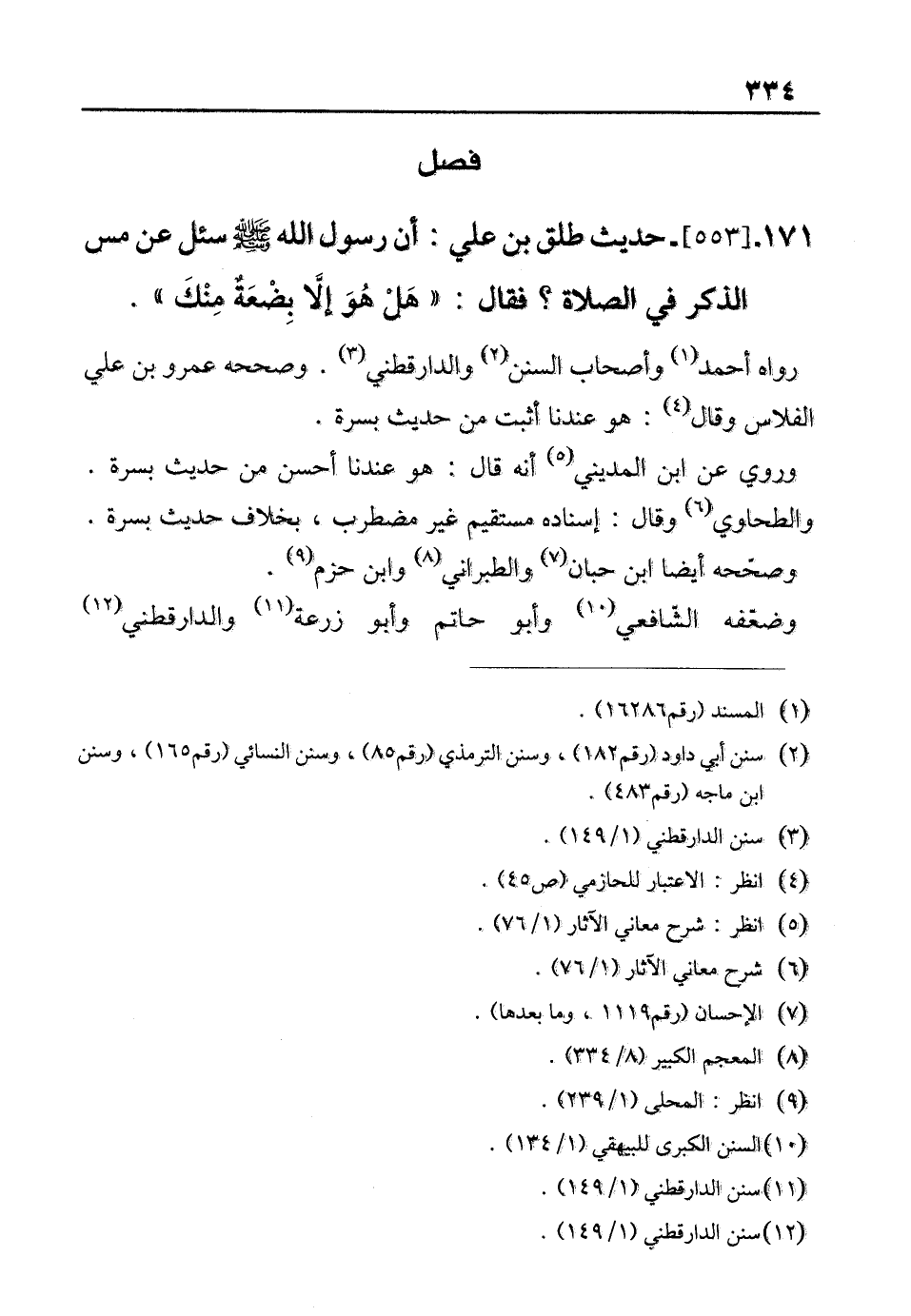 171 - [553]- حديث طلق بن علي: أن رسول الله - صلى الله عليه وسلم - سئل عن مس الذكر في الصلاة؟ فقال: "هل هو إلا بضعة منك".