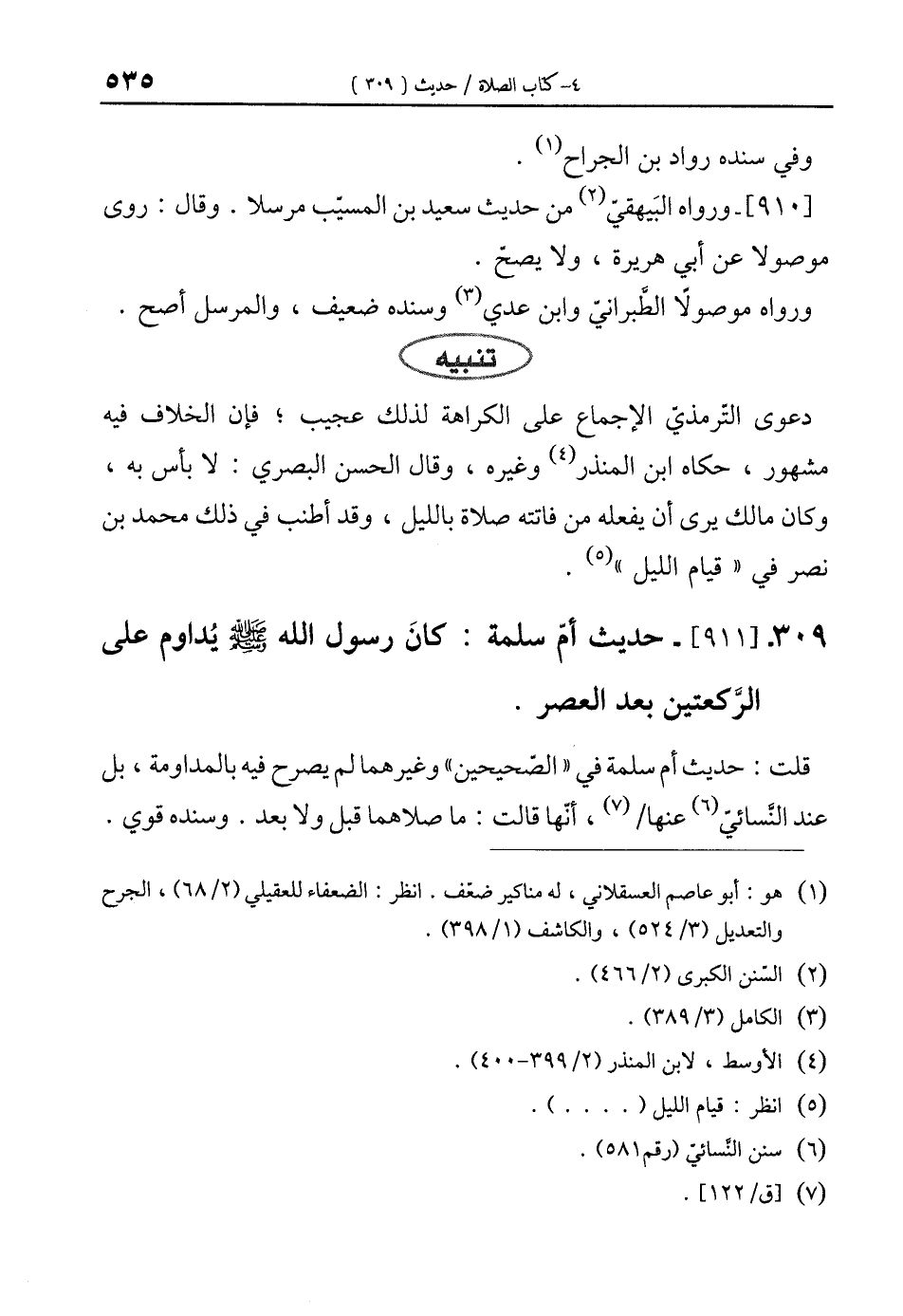309 - [911]- حديث أمّ سلمة: كانَ رسول الله - صلى الله عليه وسلم - يدُاوم على الرَّكعتين بعد العصر.