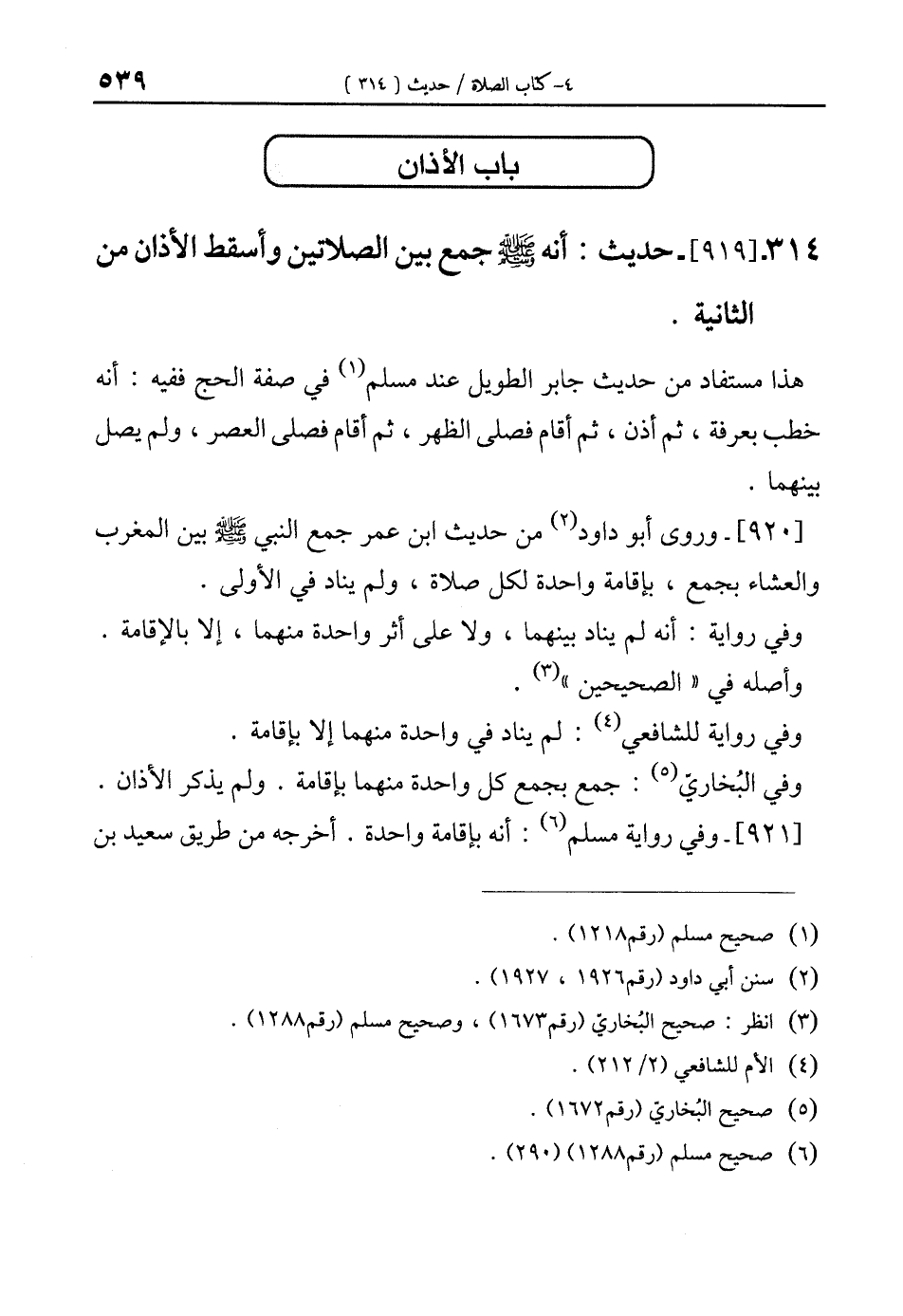 314 - [919]- حديث: أنه - صلى الله عليه وسلم - جمع بين الصلاتين وأسقط الأذان من الثانية.