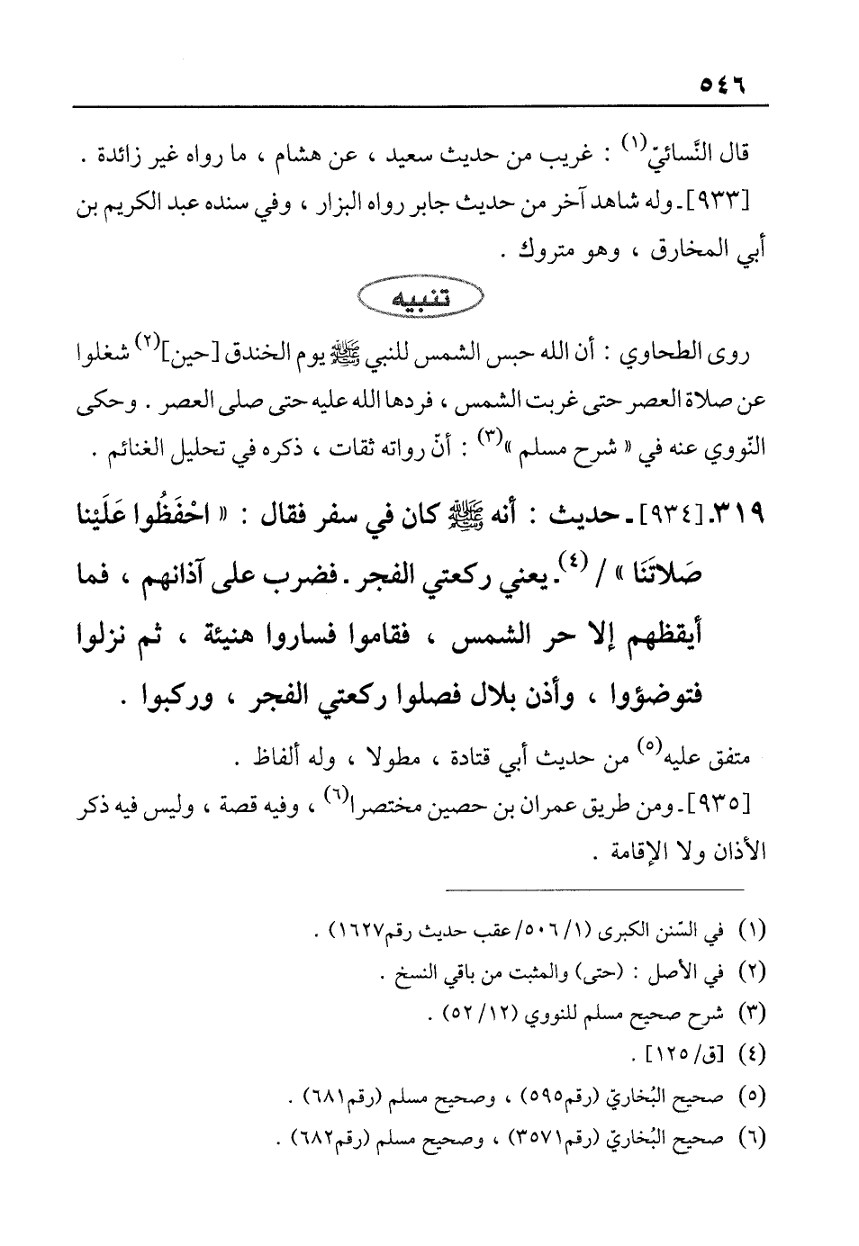 319 - [934]- حديث: أنه - صلى الله عليه وسلم - كان في سفر فقال: "احْفَظُوا عَلَيْنا صَلاَتنَا" / (¬4). يعني ركعتي الفجر. فضرب صلى آذانهم، فما أيقظهم إلا حر الشمس، فقاموا فساروا هنيئة، ثم نزلوا فتوضؤوا، وأذن بلال فصلوا ركعتي الفجر، وركبوا.