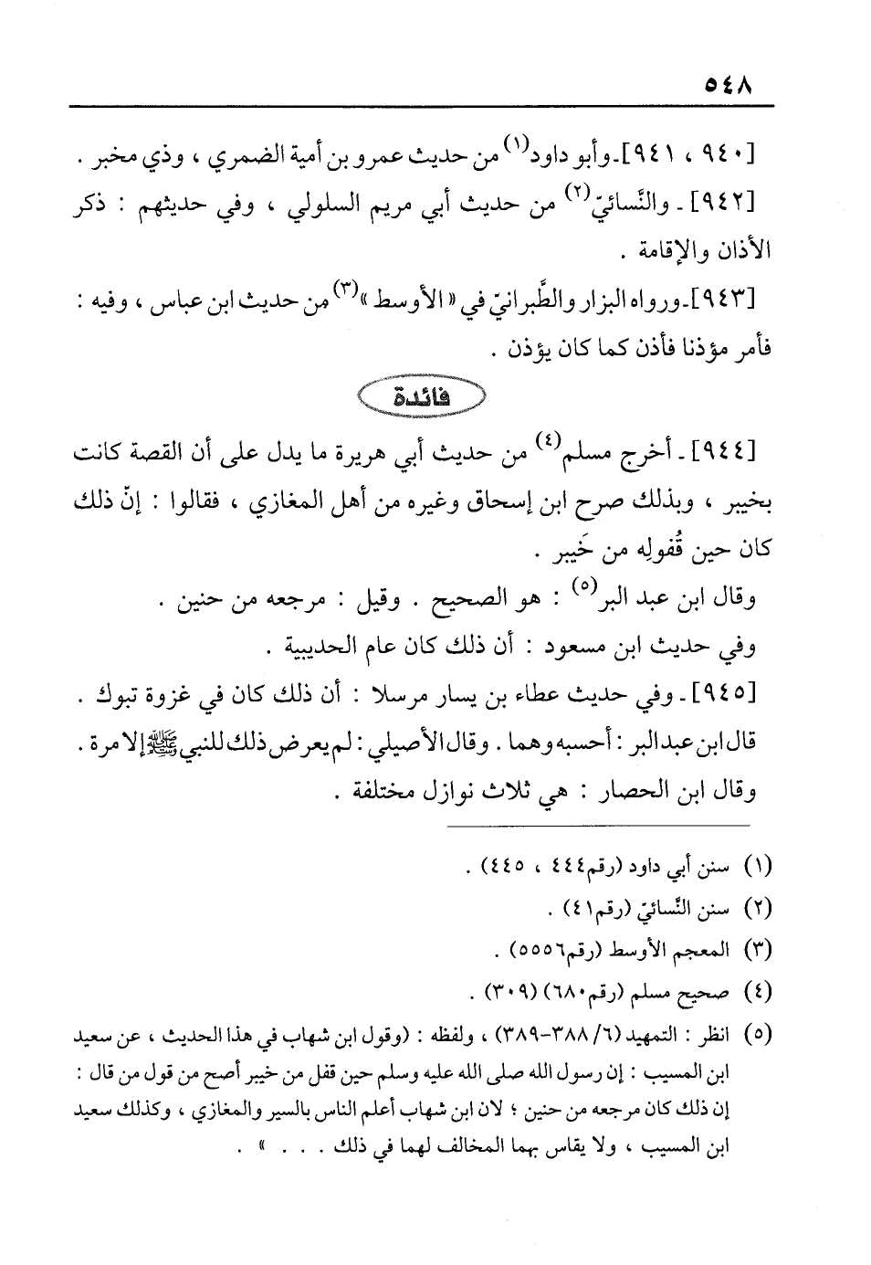 (¬5) انظر: التمهيد (6/ 388 - 389)، ولفظه: (وقول ابن شهاب في هذا الحديث، عن سعيد ابن المسيب: إن رسول الله صلى الله عليه وسلم حين قفل من خيبر أصح من قول من قال: إن ذلك كان مرجعه من حنين، لان ابن شهاب أعلم الناس بالسير والمغازي، وكذلك سعيد ابن المسيب، ولا يقاس بهما المخالف لهما في ذلك ... ".