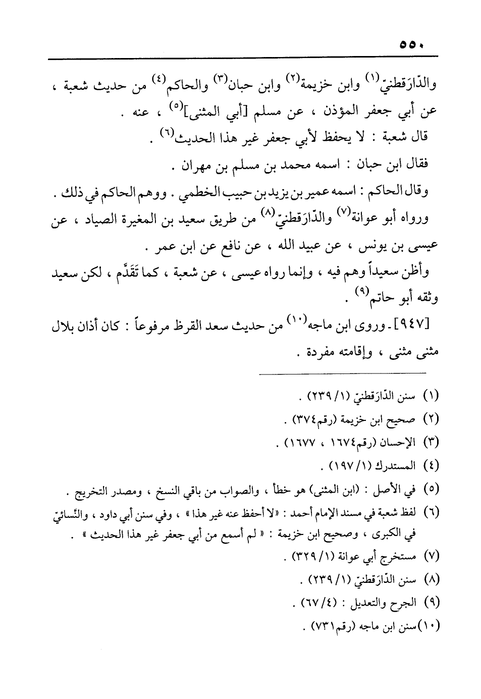 [947]- وروى ابن ماجه (¬10) من حديث سعد القرظ مرفوعًا: كان أذان بلال مثنى مثنى، وإقامته مفردة.