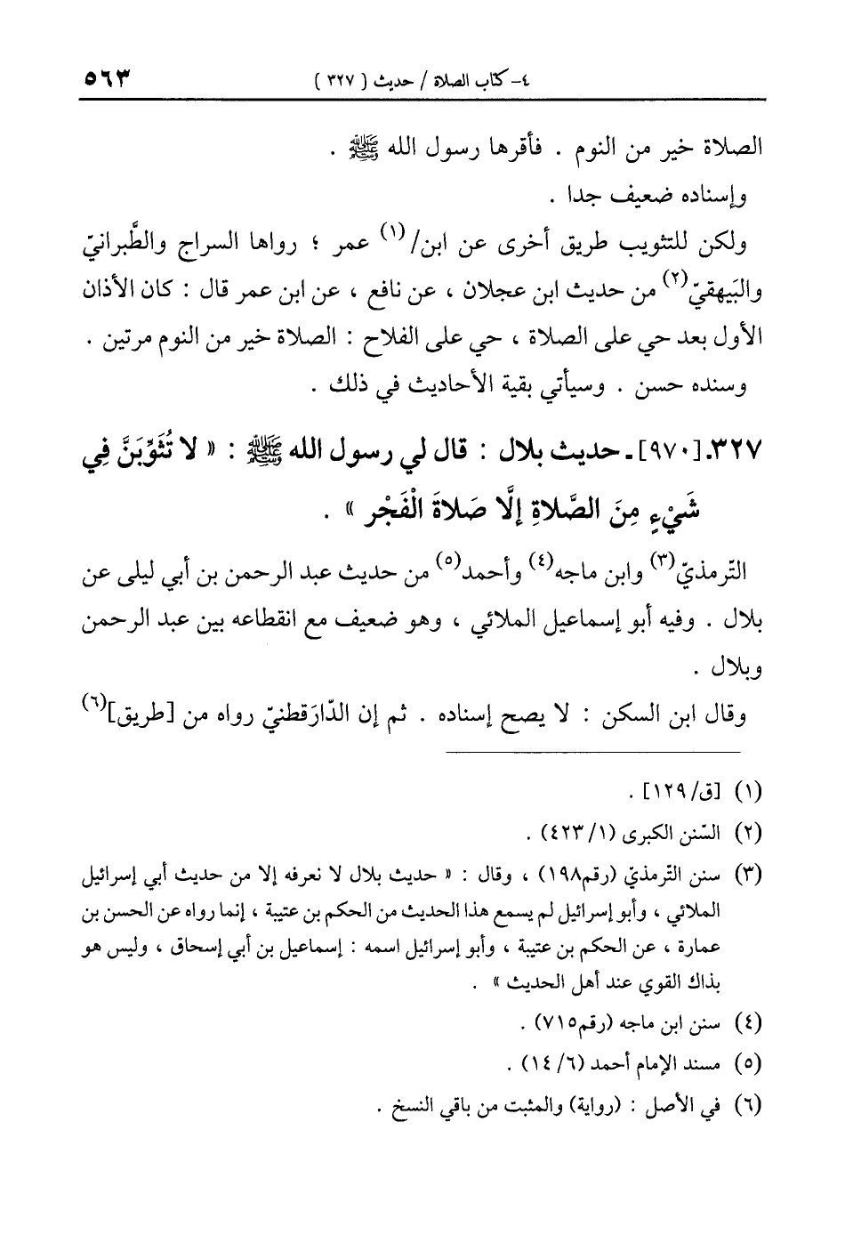 (¬3) سنن التّرمذيّ (رقم 198)، وقال: "حديث بلال لا نعرفه إلا من حديث أبي إسرائيل الملائي، وأبو إسرائيل لم يسمع هذا الحديث من الحكم بن عتيبة، إنما رواه عن الحسن بن عمارة، عن الحكم بن عتيبة، وأبو إسرائيل اسمه: إسماعيل بن أبي إسحاق، وليس هو بذاك القوي عند أهل الحديث".