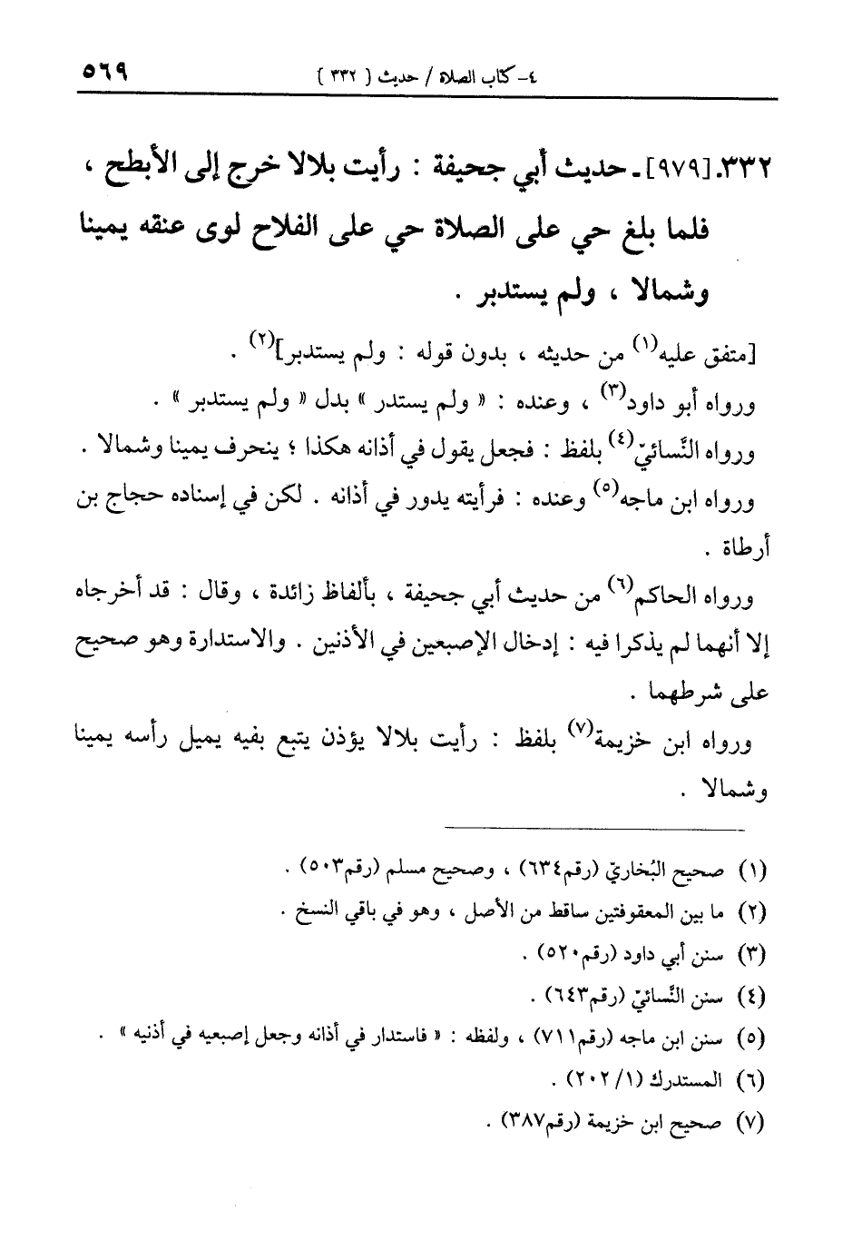 332 - [979]- حديث أبي جحيفة: رأيت بلالا خرج إلى الأبطح، فلما بلغ حي على الصلاة حى على الفلاح لوى عنقه يمينا وشمالا، ولم يستدبر.
