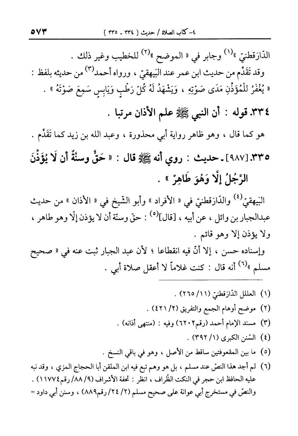 335 - [987]- حديث: روي أنه - صلى الله عليه وسلم - قال: "حَقٌّ وسنَّةٌ أن لَا يُؤَذِّنَ الرَّجُلُ إلَّا وَهُوَ طَاهِرٌ".