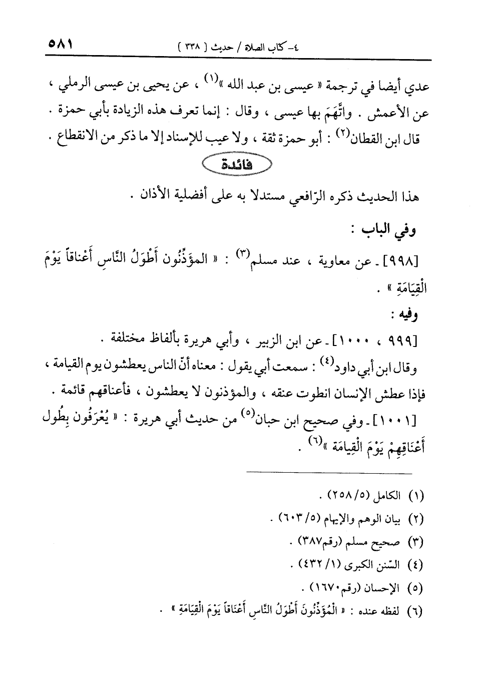 (¬6) لفظه عنده: "الْمُؤَذِّنُونَ أَطْوَلُ النَّاسِ أَعْنَاقًا يَومَ الْقِيَامَةِ".