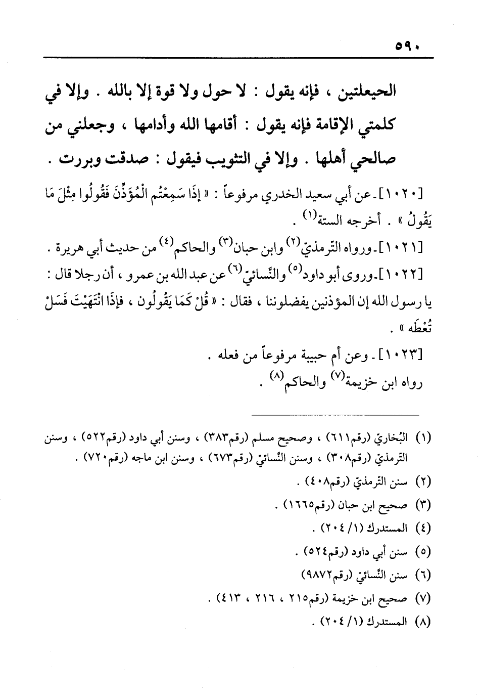 [1020]- عن أبي سعيد الخدري مرفوعًا: "إذا سَمِعْتُم الْمُؤَذِّنَ فَقُولُوا مِثْلَ مَا يَقُولُ". أخرجه الستة (¬1).