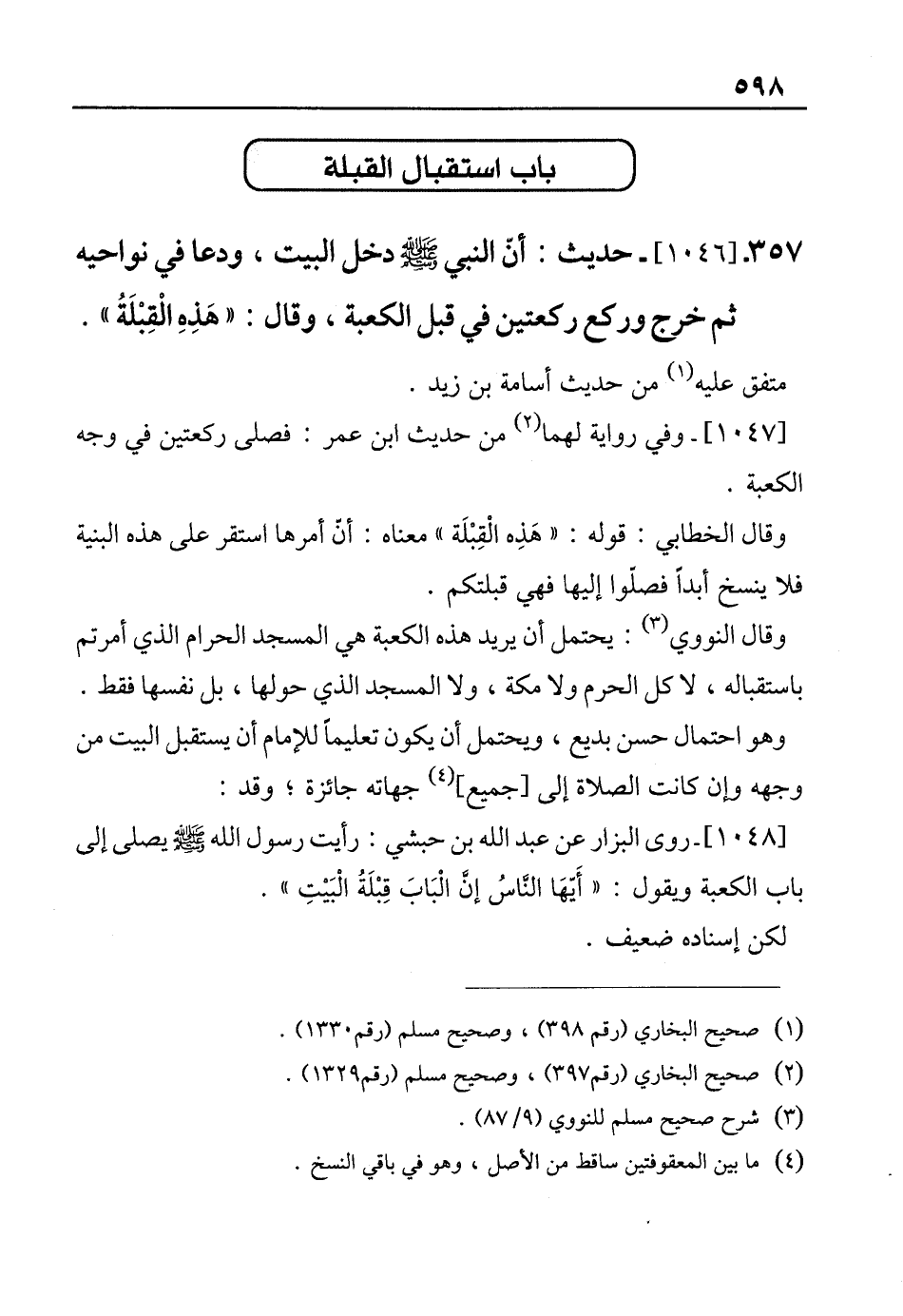 357 - [1046]- حديث: أنّ النبي - صلى الله عليه وسلم - دخل البيت، ودعا في نواحيه ثم خرج وركع ركيعتين في قبل الكعبة، وقال: "هَذِهِ الْقِبْلَةُ".