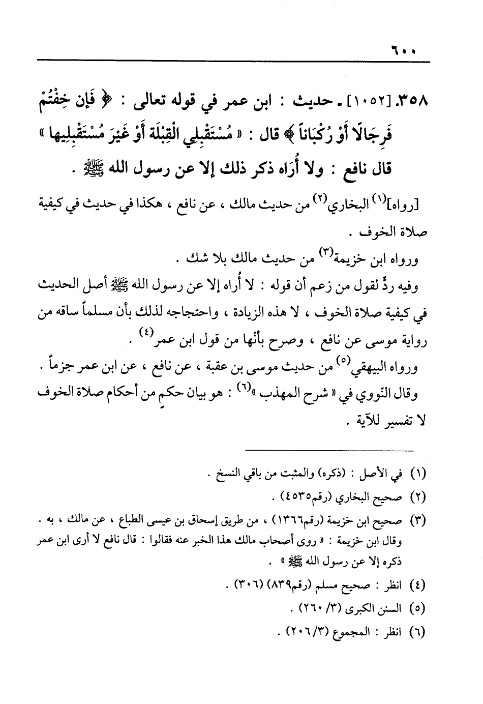 385 - [1052]- حديث: ابن عمر في قوله تعالى: {فَإِنْ خِفْتُمْ فَرِجَالًا أَوْ رُكْبَانًا} قال: "مُسْتَقْبِلِي الْقِبْلَة أَوْ غَيْرَ مُسْتَقْبِلِيها" قال نافع: ولا أُرَاه ذكر ذلك إلا عن رسول الله - صلى الله عليه وسلم -.