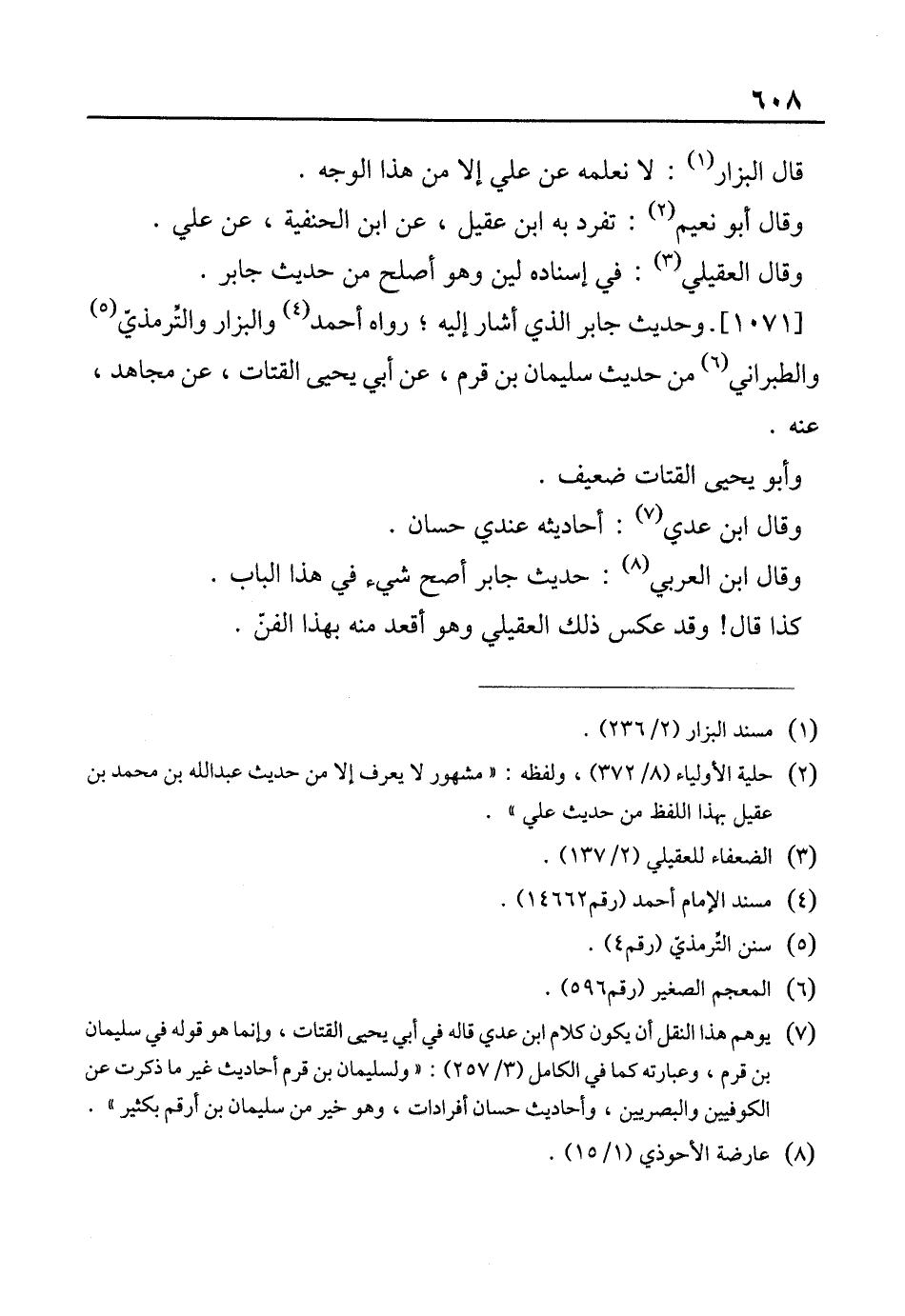 (¬7) يوهم هذا النقل أن يكون كلام ابن عدي قاله في أبي يحيى القتات، وإنما هو قوله في سليمان بن قرم، وعبارته كما في الكامل (3/ 257): "ولسليمان بن قرم أحاديث غير ما ذكرت عن الكوفيين والبصريين، وأحاديث حسان أفرادات، وهو خير من سليمان بن أرقم بكثير".