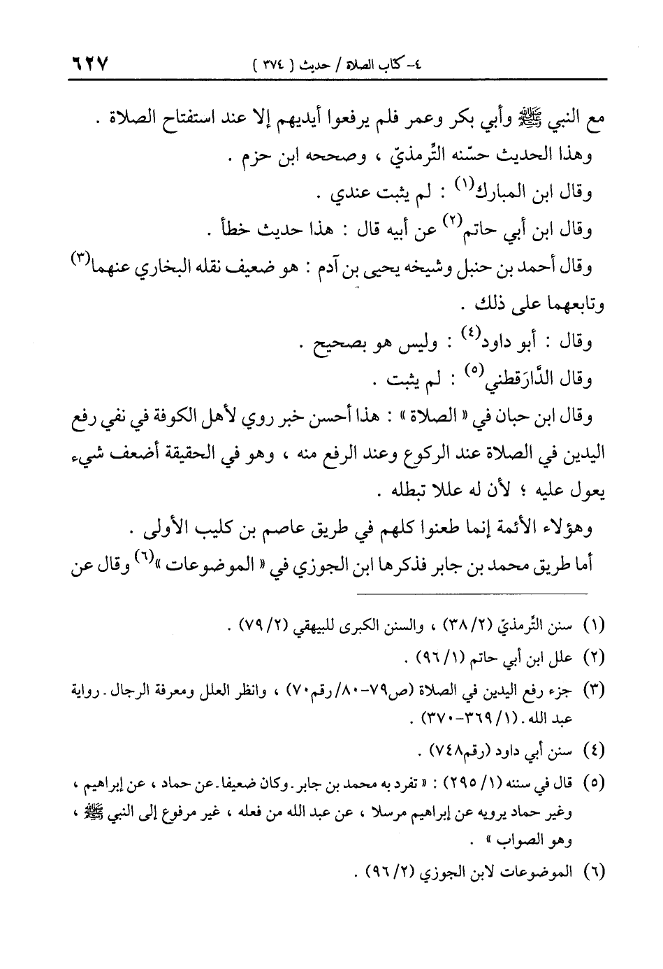 وقال ابن حبان في "الصلاة": هذا أحسن خبر روي لأهل الكوفة في نفي رفع اليدين في الصلاة عند الركوع وعند الرفع منه، وهو في الحقيقة أضعف شيء يعول عليه؛ لأن له عللا تبطله.