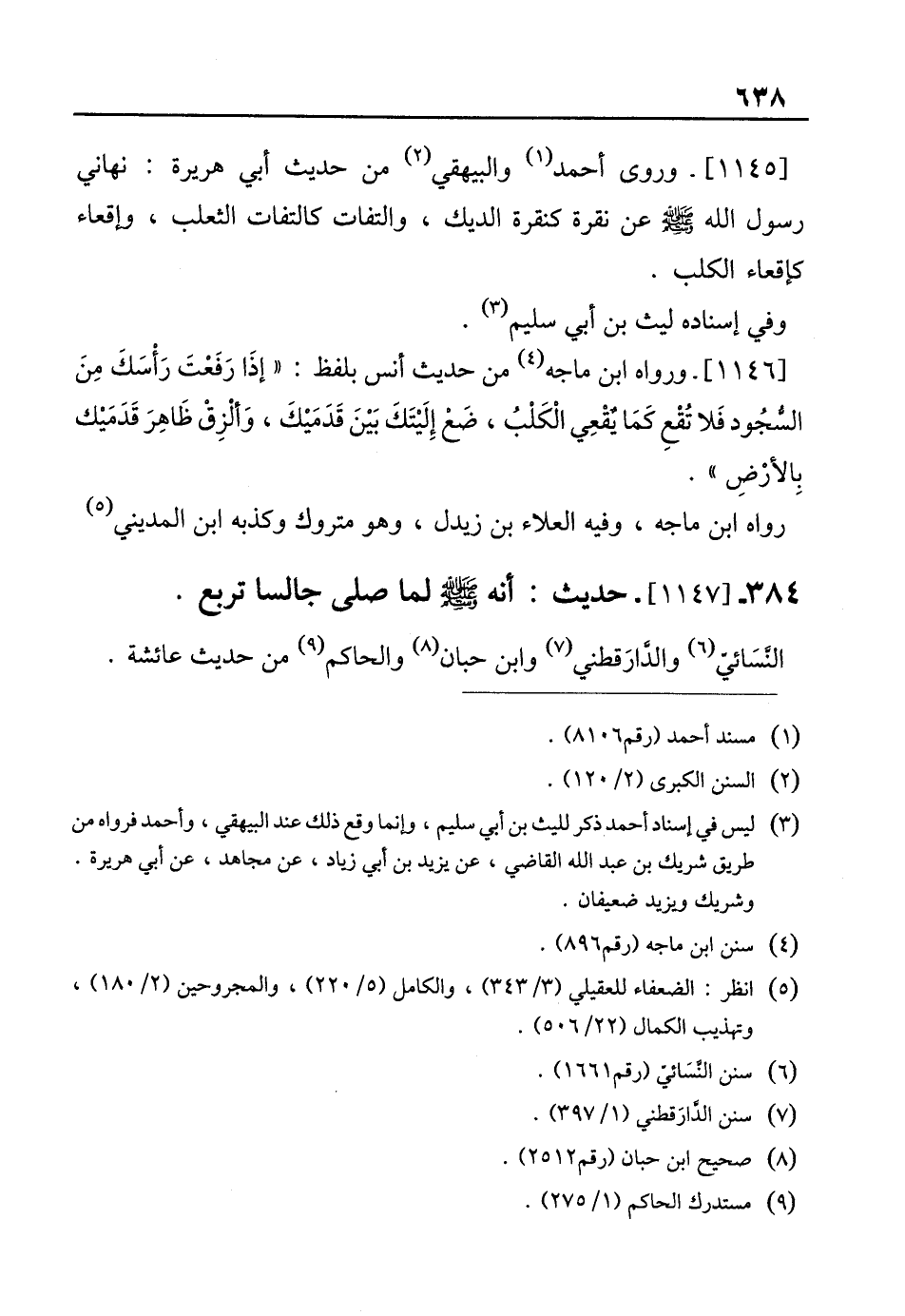 [1145]- وروى أحمد (¬1) والبيهقي (¬2) من حديث أبي هريرة: نهاني رسول الله - صلى الله عليه وسلم - عن نقرة كنقرة الديك، والتفات كالتفات الثعلب، وإقعاء كإقعاء الكلب.
