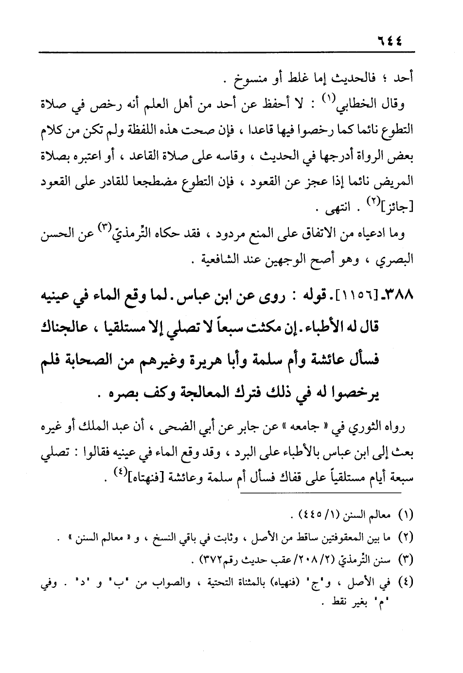 388 - [1156]. قوله: روى عن ابن عباس. لما وقع الماء في عينيه قال له الأطباء. إن مكثت سبعًا لا تصلي إلا مستلقيا، عالجناك فسأل عائشة وأم سلمة وأبا هريرة وغيرهم من الصحابة فلم يرخصوا له في ذلك فترك المعالجة وكف بصره.