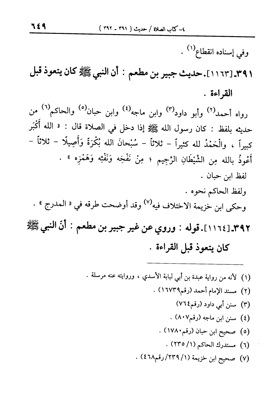 391 - [1163]- حديث جبير بن مطعم: أن النبي - صلى الله عليه وسلم - كان يتعوذ قبل القراءة.