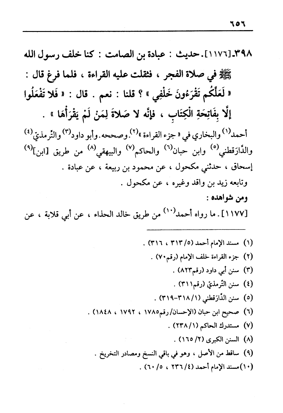 398 - [1176]- حديث: عبادة بن الصامت: كنا خلف رسول الله - صلى الله عليه وسلم - في صلاة الفجر، فثقلت عليه القراءة، فلما فرغ قال: "لَعَلَّكُم تَقْرَءُونَ خَلْفِي"؟ قلنا: نعم. قال: "فَلا تَفْعَلُوا إلَّا بِفَاتِحَةِ الْكِتَابِ، فإنَّه لا صَلاةَ لِمَنْ لَمْ يَقْرَأْهَا".