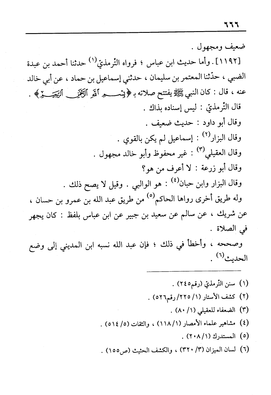 [1192]- وأما حديث ابن عباس، فرواه التِّرمذيّ (¬1) حدثنا أحمد بن عبدة الضبي، حدّثنا المعتمر بن سليمان، حدثني إسماعيل بن حماد، عن أبي خالد عنه، قال: كان النبي - صلى الله عليه وسلم - فتتح صلاته بـ {بِسْمِ اللَّهِ الرَّحْمَنِ الرَّحِيمِ}.