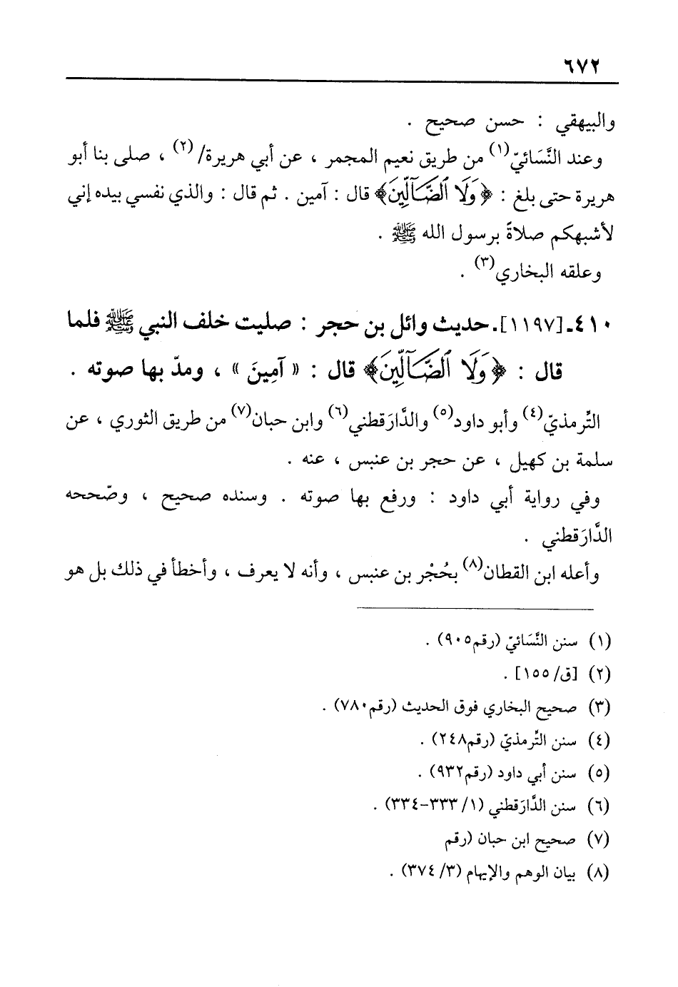410 - [1197]- حديث وائل بن حجر: صليت خلف النبي - صلى الله عليه وسلم - فلما قال: {وَلَا الضَّالِّينَ} قال: "آمِينَ"، ومدّ بها صوته.