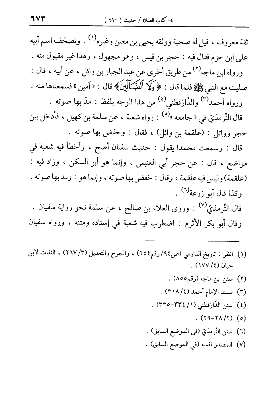 قال التِّرمذيّ في "جامعه" (¬5): رواه شعبة، عن سلمة بن كهيل، فأدخل بين حجر ووائل: (علقمة بن وائل)، فقال: وخفض بها صوته.