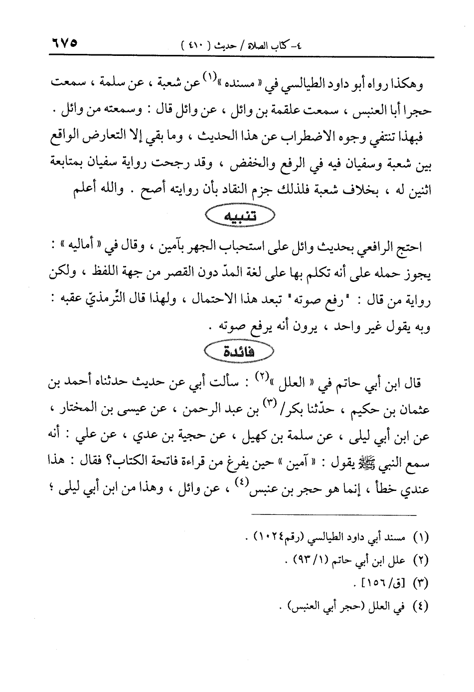 قال ابن أبي حاتم في "العلل" (¬2): سالت أبي عن حديث حدثناه أحمد بن عثمان بن حكيم، حدّثنا بكر/ (¬3) بن عبد الرحمن، عن عيسى بن المختار، عن ابن أبي ليلى، عن سلمة بن كهيل، عن حجية بن عدي، عن علي: أنه سمع النبي - صلى الله عليه وسلم - يقول: "آمين" حين يفرغ من قراءة فاتحة الكتاب؟ فقال: هذا عندي خطأ، إنما هو حجر بن عنبس (¬4)، عن وائل، وهذا من ابن أبي ليلى؛