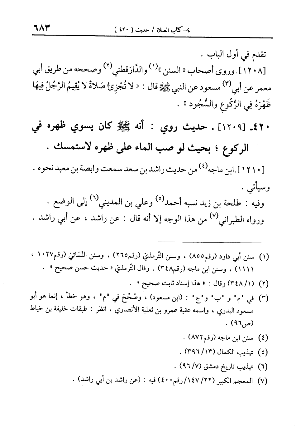 [1208]- وروى أصحاب "السنن" (¬1) والدَّارَقطني (¬2) وصححه من طريق أبي معمر عن أبي (¬3) مسعود عن النبي - صلى الله عليه وسلم - قال: "لا تًجْزِئُ صَلاةٌ لا يُقِيمُ الرَّجُلُ فِيهَما ظَهْرَهُ في الرُّكُوعِ والسُّجُود".