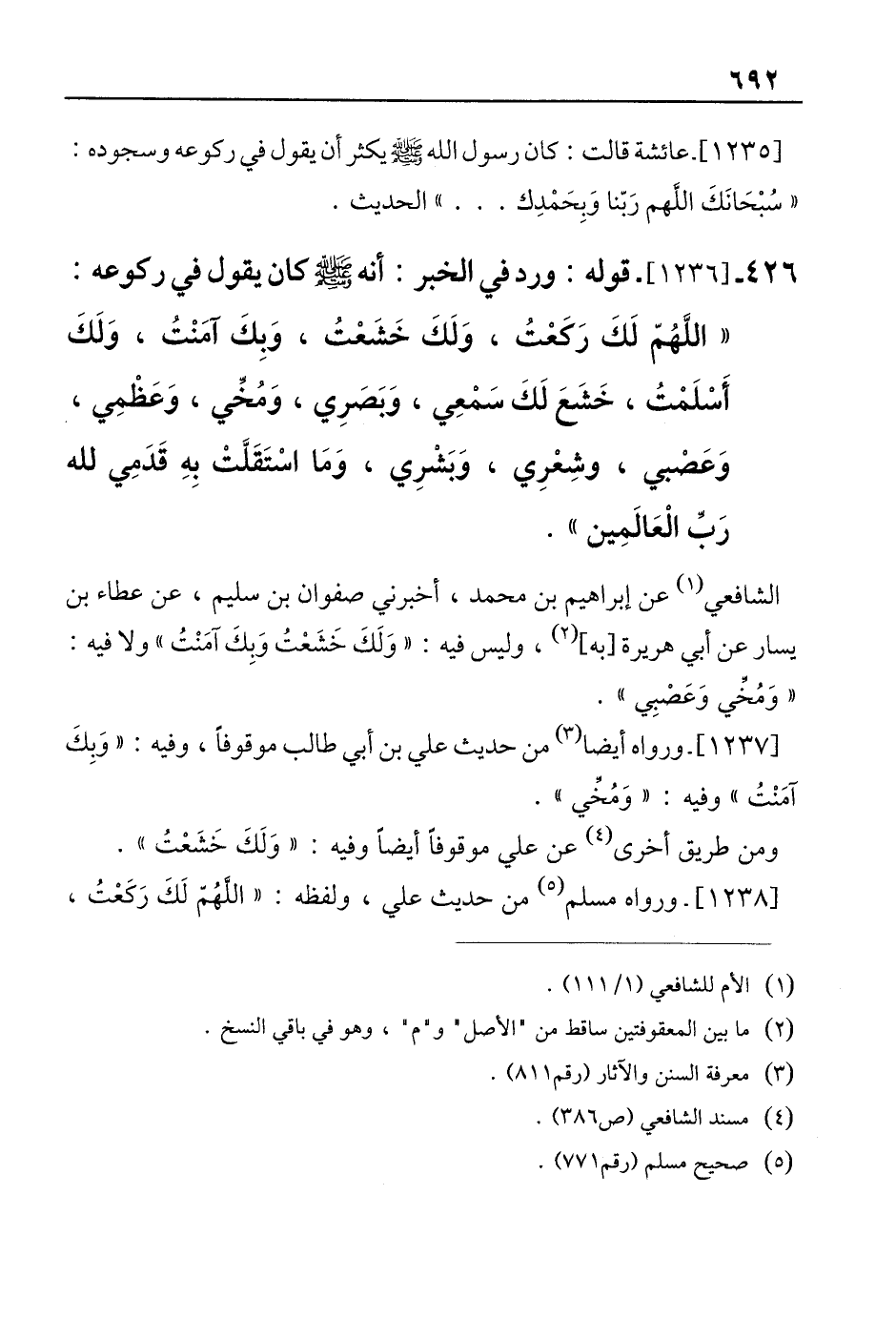 426 - [1236]- قوله: ورد في الخبر: أنه - صلى الله عليه وسلم - كان يقول في ركوعه: "اللَّهُمّ لَكَ رَكعْتُ، وَلَكَ خَشَعْتُ، وَبِكَ آمَنْتُ، وَلَكَ أَسْلَمْتُ، خَشَعَ لَكَ سَمْعِي، وَبَصَرِي، وَمُخِّي، وَعَظْمِي، وَعَصْبي، وشِعْرِي، وَبَشْرِي، وَمَا اسْتَقَلَّتْ بِهِ قَدَمِي لله رَبّ الْعَالَمِين".