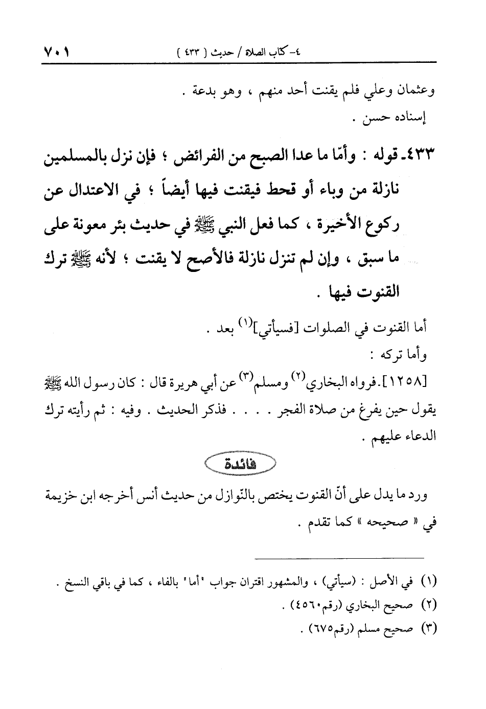 433 - قوله: وأمّا ما عدا الصبح من الفرائض؛ فإن نزل بالمسلمين نازلة من وباء أو قحط فيقنت فيها أيضًا؛ في الاعتدال عن ركوع الأخيرة، كما فعل النبي - صلى الله عليه وسلم - في حديث بئر معونة على ما سبق، وإن لم تنزل نازلة فالأصح لا يقنت؛ لأنه - صلى الله عليه وسلم - ترك القنوت فيها.