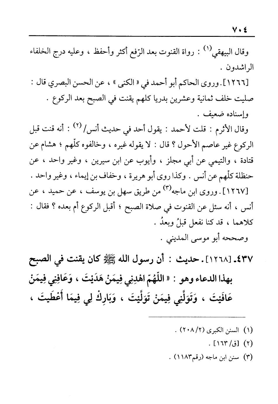 [1267]- وروى ابن ماجه (¬3) من طريق سهل بن يوسف، عن حميد، عن أنس، أنه سئل عن القنوت في صلاة الصبح؛ أقبل الركوع أم بعده؟ فقال: كلاهما، قد كنا نفعل قبلُ وبعدُ.