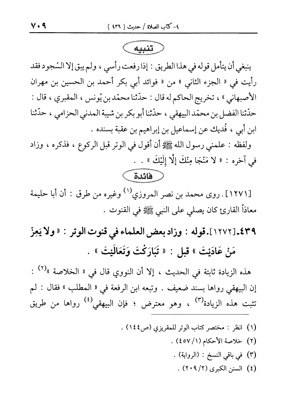 439 - [2721]- قوله: وزاد بعض العلماء في قنوت الوتر: "ولا يَعِزّ مَنْ عَادَيْتَ" قبل: "تَبَارَكتَ وَتَعَالَيتَ".