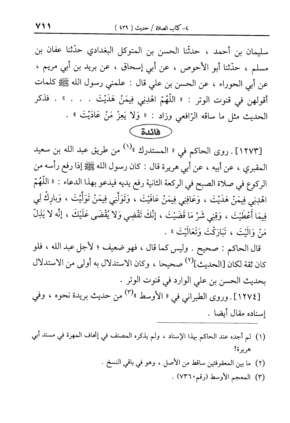 [1273]- روى الحاكم في "المستدرك" (¬1) من طريق عبد الله بن سعيد المقبري، عن أبيه، عن أبي هريرة قال: كان رسول الله - صلى الله عليه وسلم - إذا رفع رأسه من الركوع في صلاة الصبح في الركعة الثانية رفع يديه فيدعو بهذا الدعاء: "اللهُمّ اهْدِنِي فِيمَنْ هَدَيْتَ، وَعَافِنِي فِيمَنْ عَافَيْتَ، وَتَوَلَّنِي فِيمَنْ تَوَلَّيْتَ، وَبارِكْ لِي فِيمَا أَعْطَيْتَ، وَقِنِي شَرَّ مَا قَضَيْتَ، إنَّكَ تَقْضِي وَلا يُقْضَى عَلَيْكَ، إنَّه لا يَذِلّ مَنْ وَالَيْتَ، تَبَارَكْتَ وَتَعَالَيْتَ".