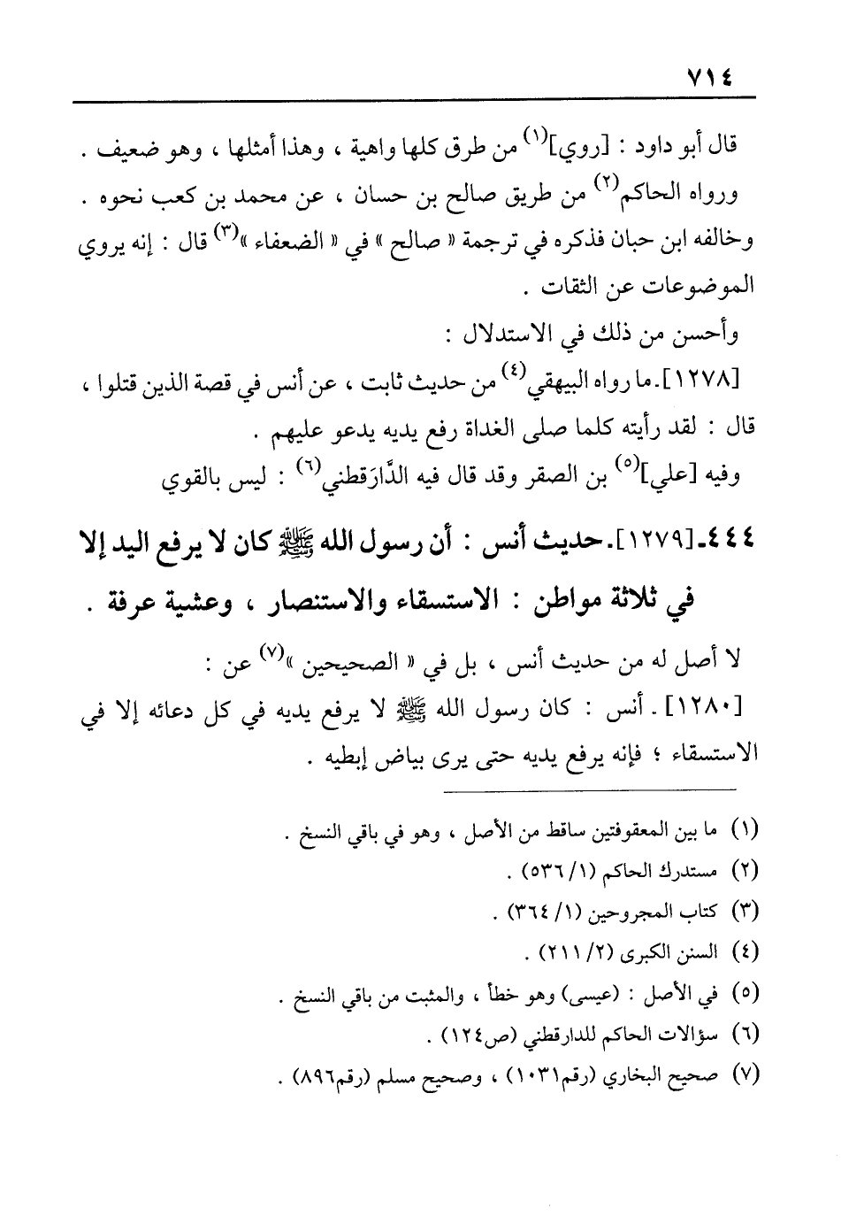 444 - [1279]- حديث أنس: أن رسول الله - صلى الله عليه وسلم - كان لا يرفع اليد إلا في ثلاثة مواطن: الاستسقاء والاستنصار، وعشية عرفة.