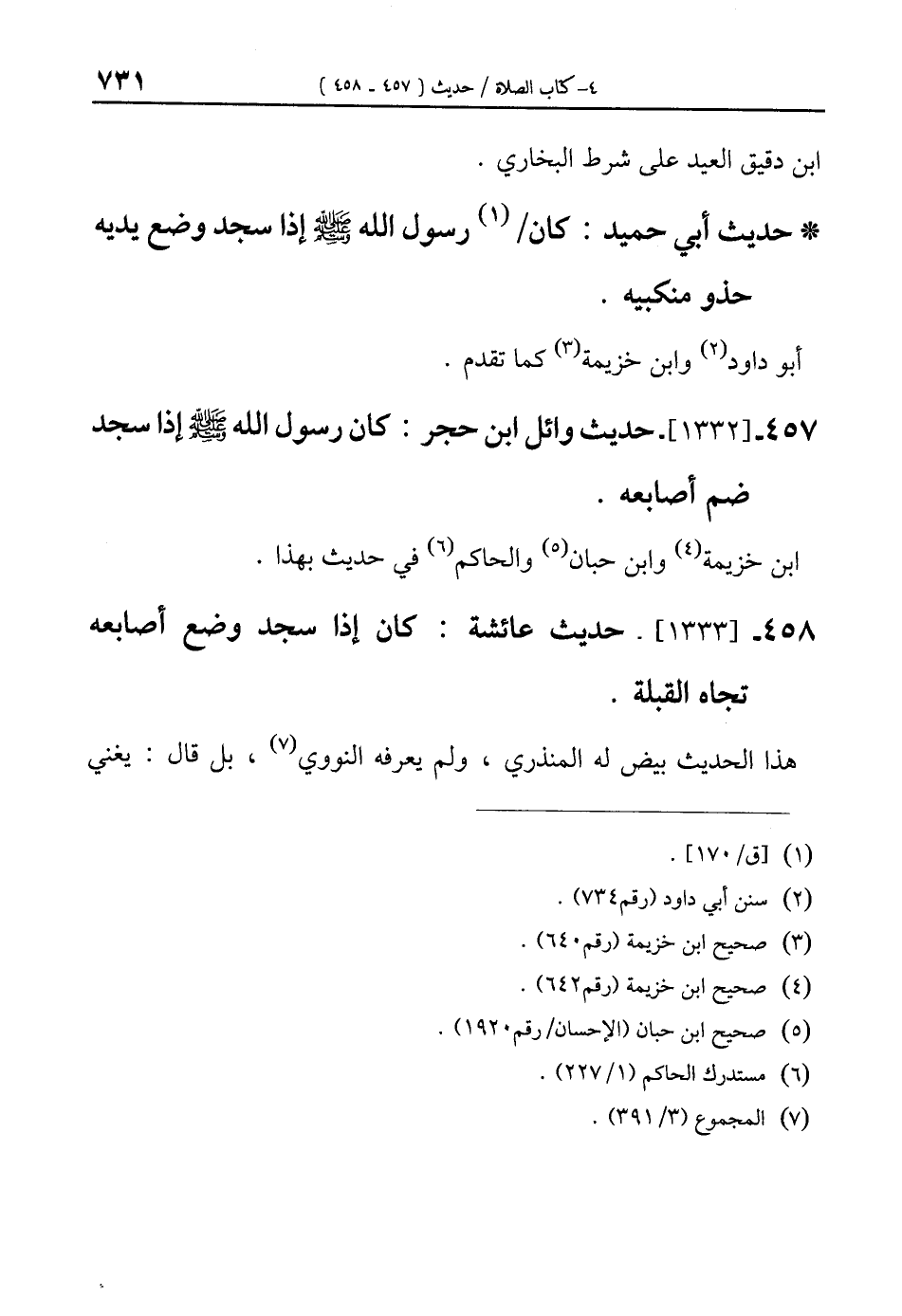 457 - [1332]- حديث وائل ابن حجر: كان رسول الله - صلى الله عليه وسلم - إذا سجد ضم أصابعه.