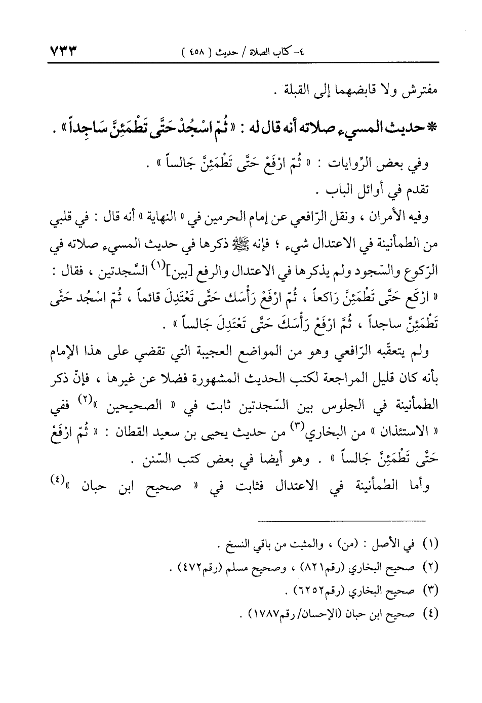 ولم يتعقّبه الرّافعي وهو من المواضع العجيبة التي تقضي على هذا الإمام بأنه كان قليل المراجعة لكتب الحديث المشهورة فضلا عن غيرها، فإنّ ذكر الطمأنينة في الجلوس بين السّجدتين ثابت في "الصحيحين" (¬2) ففي "الاستئذان" من البخاري (¬3) من حديث يحيى بن سعيد القطان: "ثُمّ ارْفَعْ حَتَّى تَطْمَئِن جَالسًا". وهو أيضا في بعض كتب السّنن.